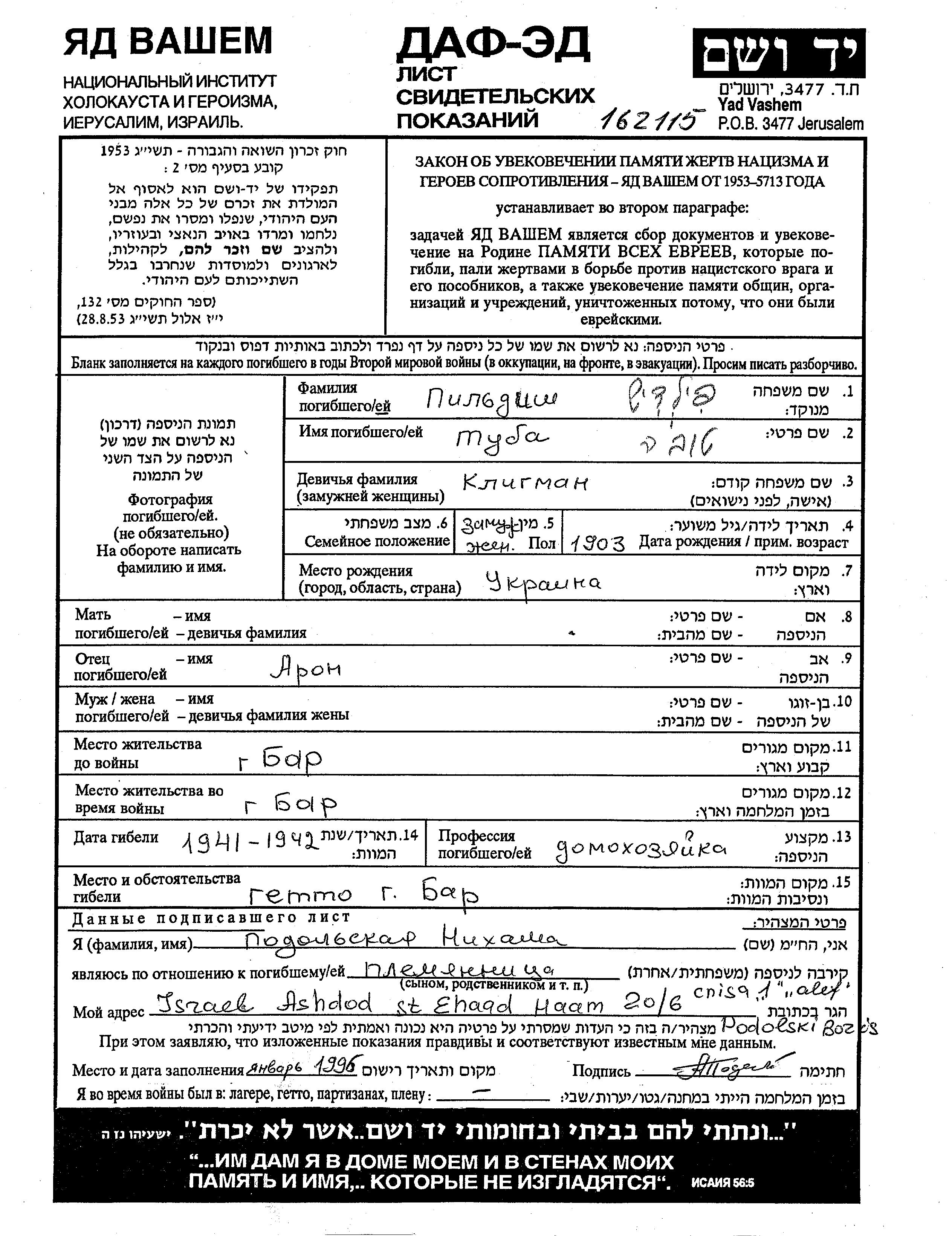 Туба Това Пильдиш, девичья фамилия Клигман, место рождения: Украина (СССР). Отец: Арон. Домохозяйка. Место жительства до войны: Бар, Украина (СССР). Место во время войны: Бар, Украина (СССР).