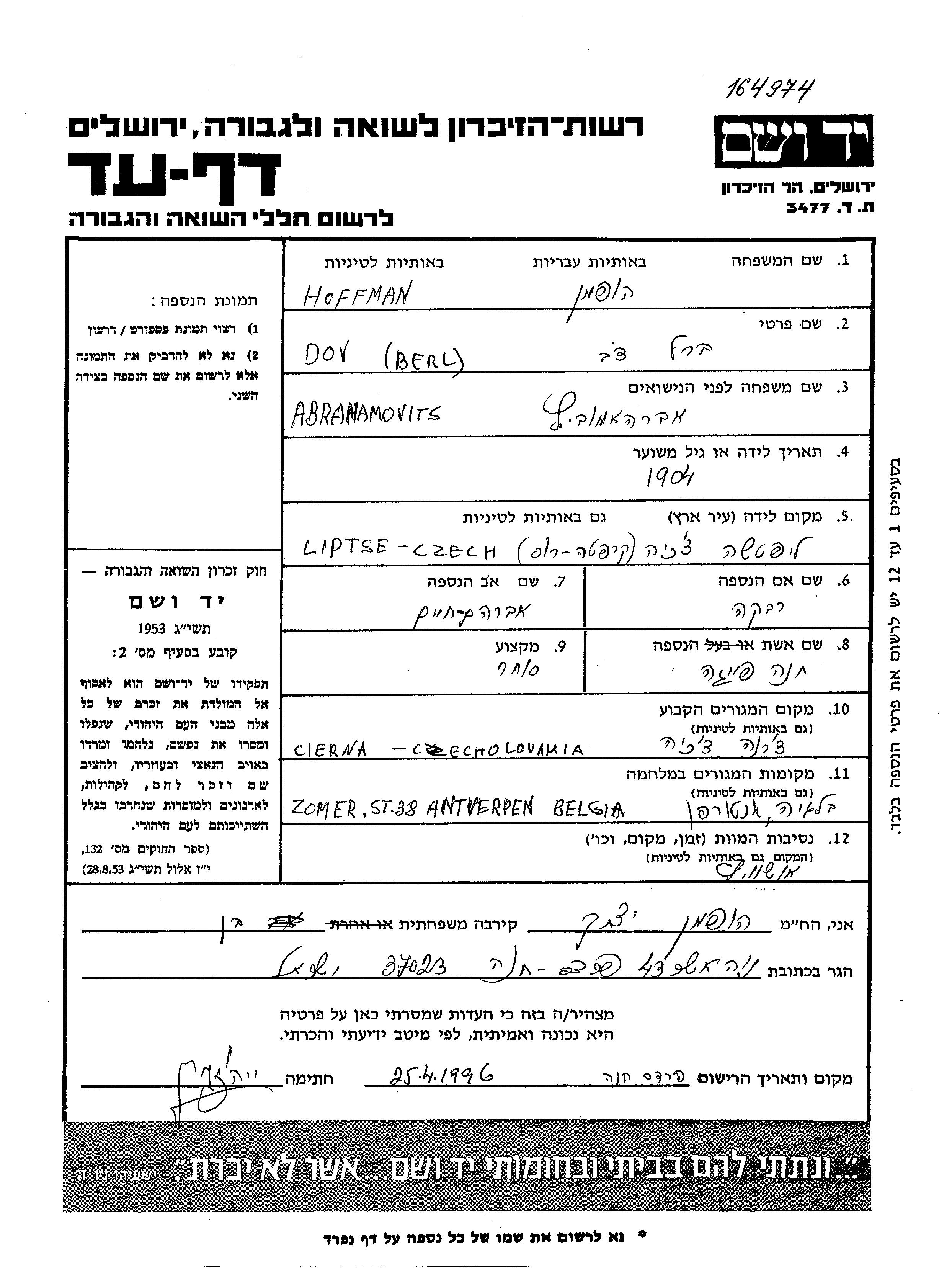 Берл Дов Хоффман Абрахамовиц, место рождения: Липча, Чехословакия. Отец: Авраам Хаим, mать:Ривка. Торговец / торговка. Женат / замужем. Место жительства до войны: Черна, Чехословакия. Место во время войны: Антверпен, Бельгия.