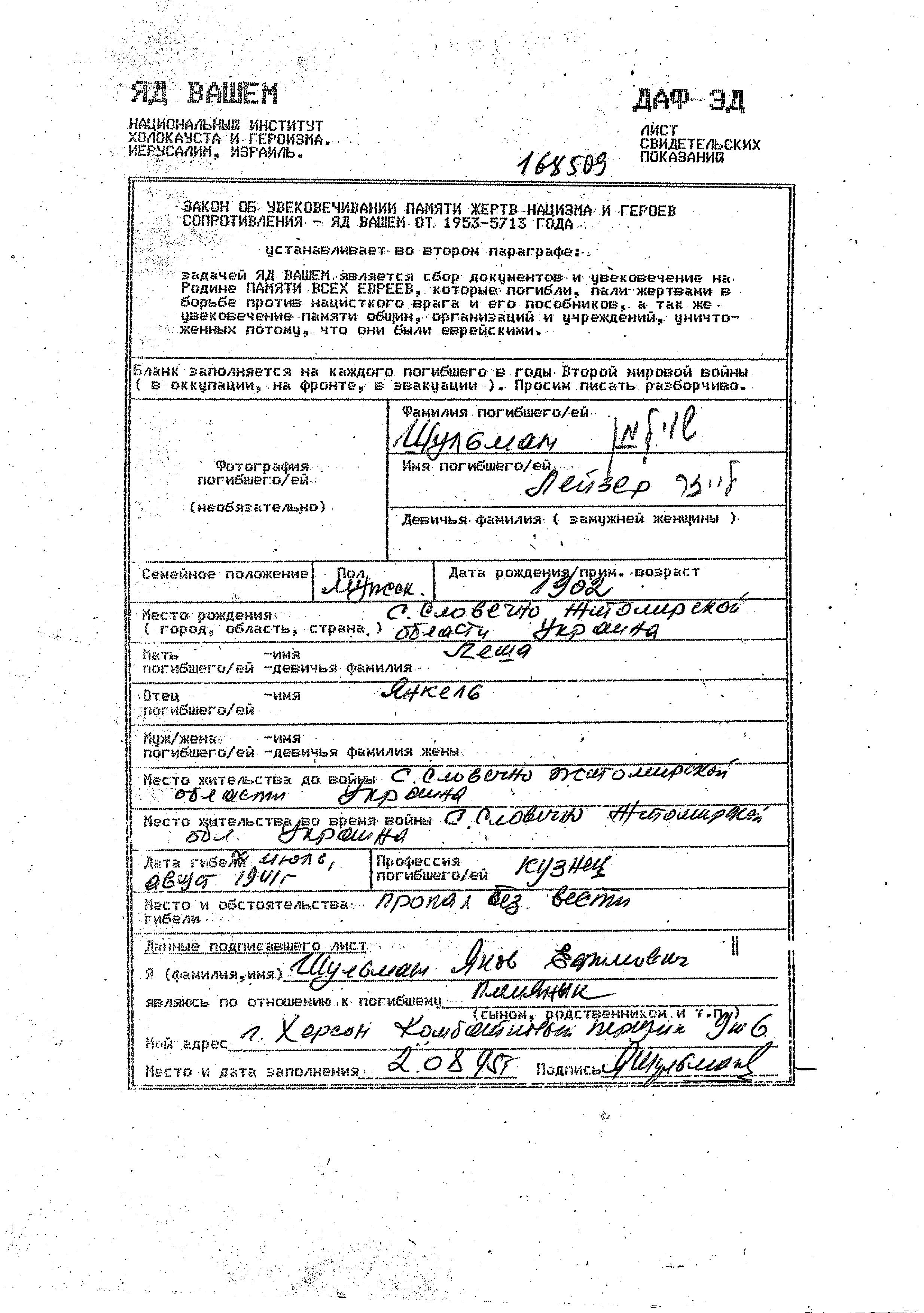 Шульман Лейзер 1902 Словечно, Украина (СССР) Лист свидетельских показаний
