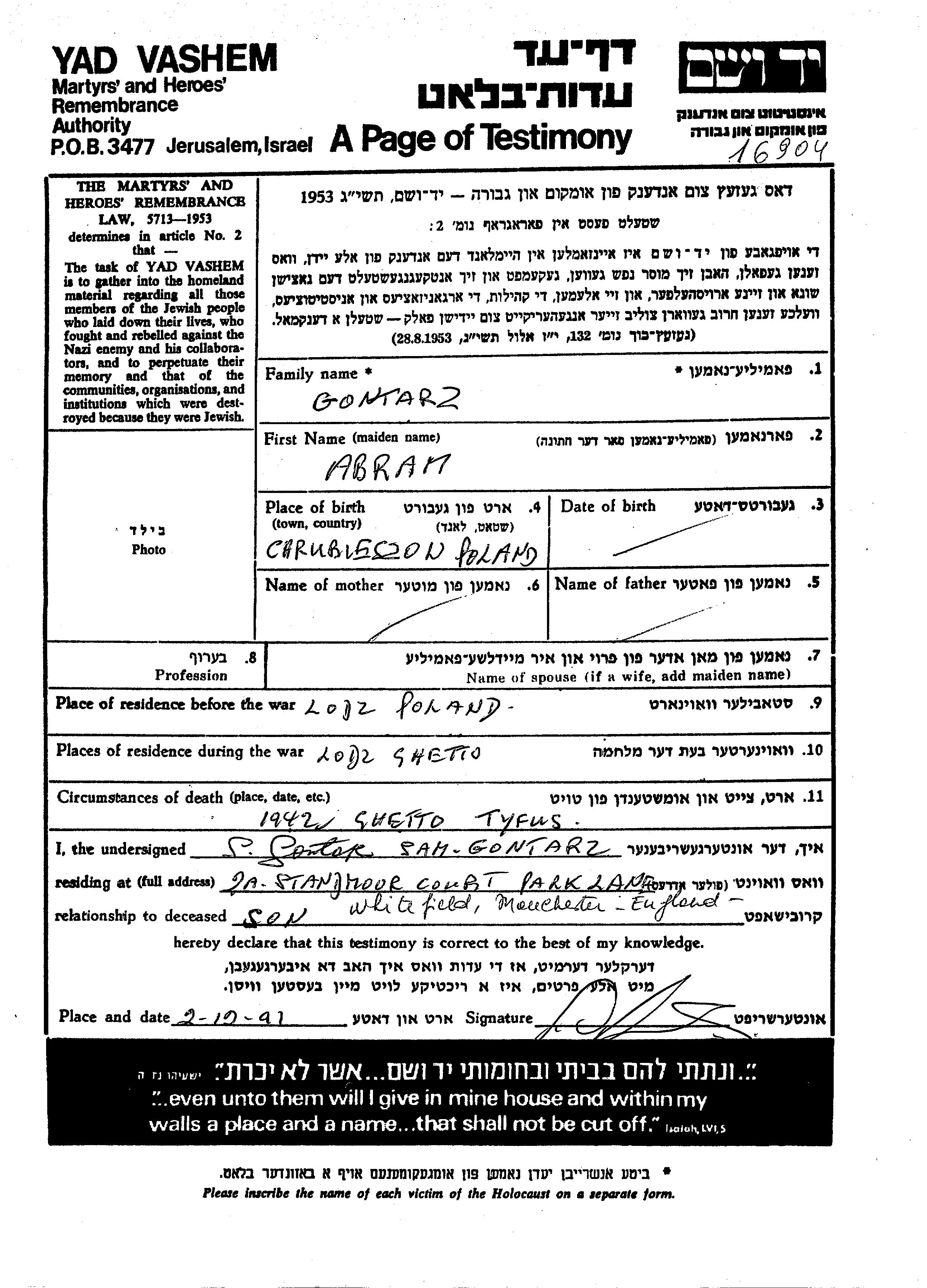 Абрам Гонтаж, место рождения: Хрубешув, Польша. Женат / замужем. Место жительства до войны: Лодзь, Польша. Место во время войны: Лодзь, Польша.