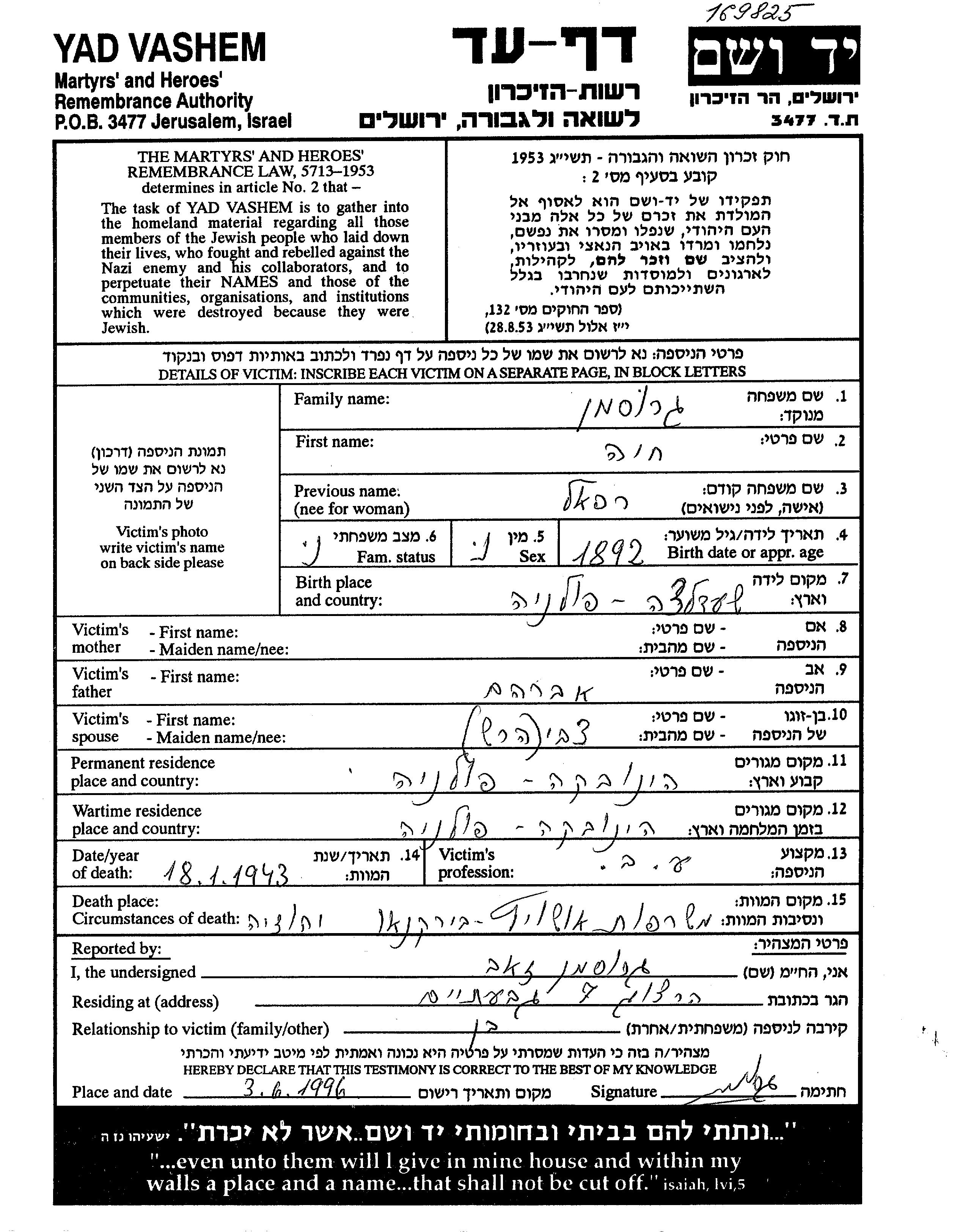 Хая Гросман, девичья фамилия Рафаэль, место рождения: Седльце, Польша. Отец: Авраам. Домохозяйка. Женат / замужем. Место жительства до войны: Хайнувка, Польша. Место во время войны: Хайнувка, Польша.