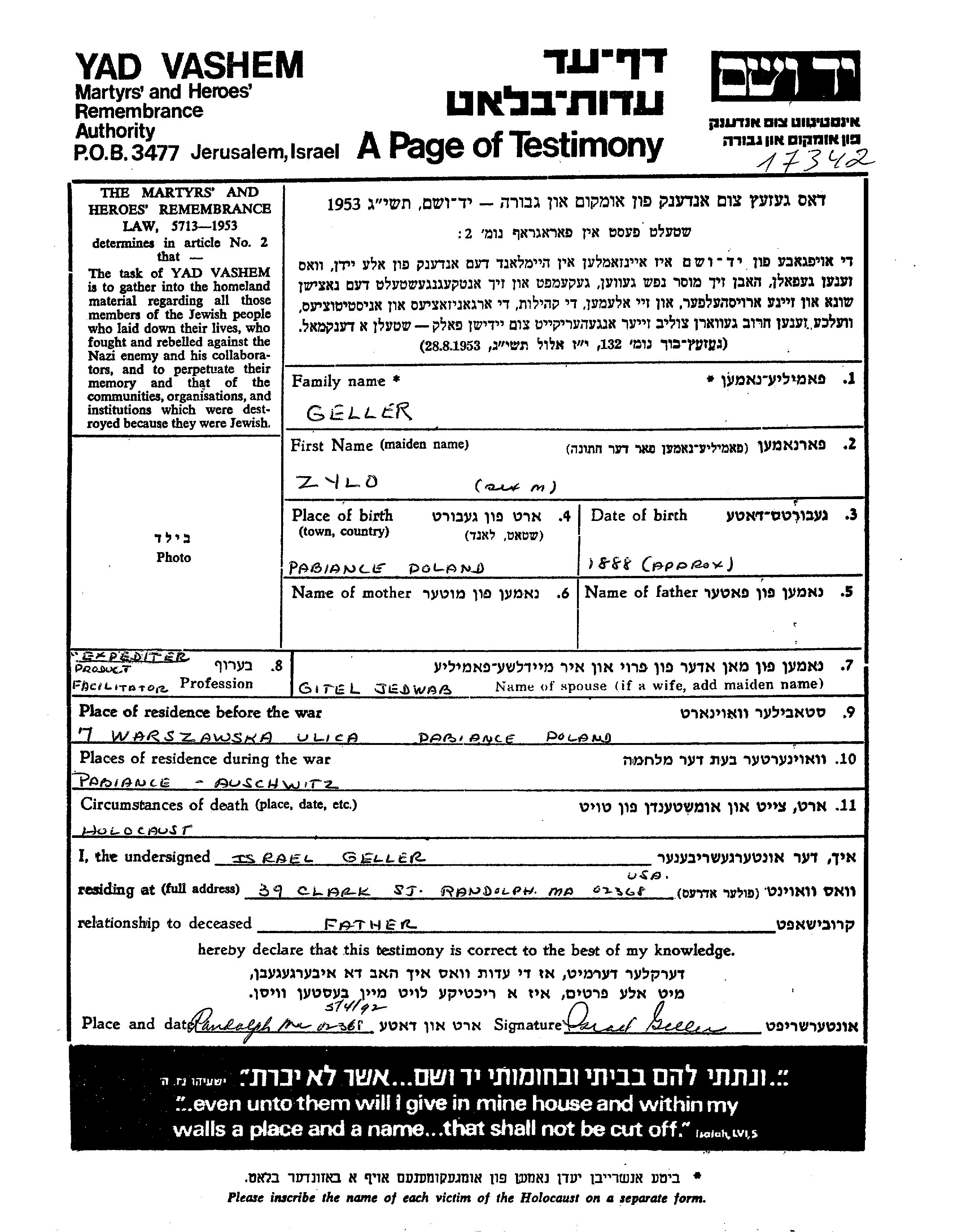 Зило Зилу Геллер, место рождения: Пабьянице, Польша. Поставщик. Женат / замужем. Место жительства до войны: Пабьянице, Польша. Место во время войны: Пабьянице, Польша.