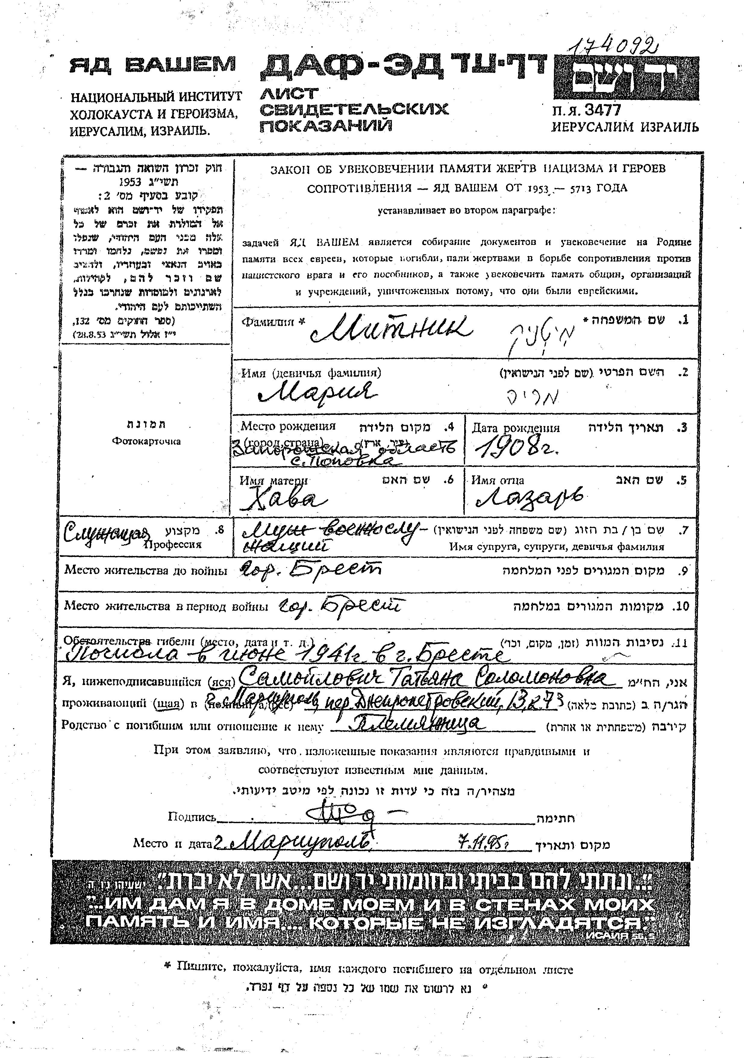 Мария Митник, место рождения: Поповка, Украина (СССР). Отец: Лазарь, mать:Хава. Клерк. Женат / замужем. Место жительства до войны: Брест, Польша. Место во время войны: Брест, Польша.