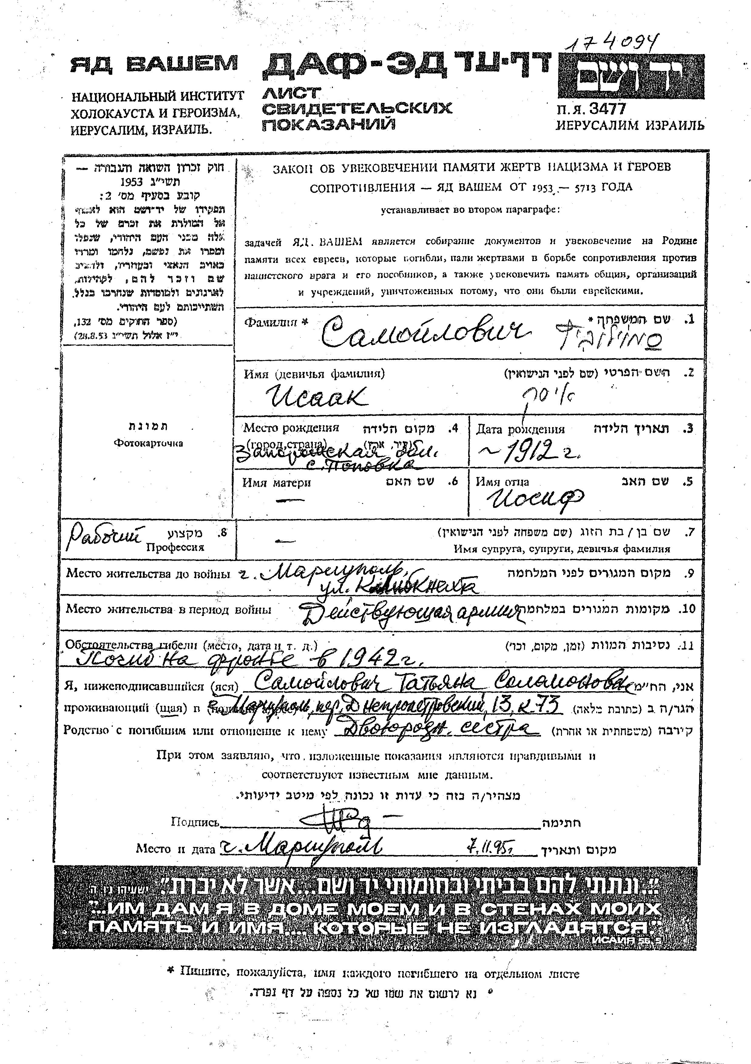 Исаак Самойлович, место рождения: Поповка, Украина (СССР). Отец: Иосиф. Рабочий / рабочая. Женат / замужем. Место жительства до войны: Мариуполь, Украина (СССР). Место во время войны: Вооруженные силы Советского Союза. Исаак погиб на военной службе. место смерти: неизвестно в 1942.