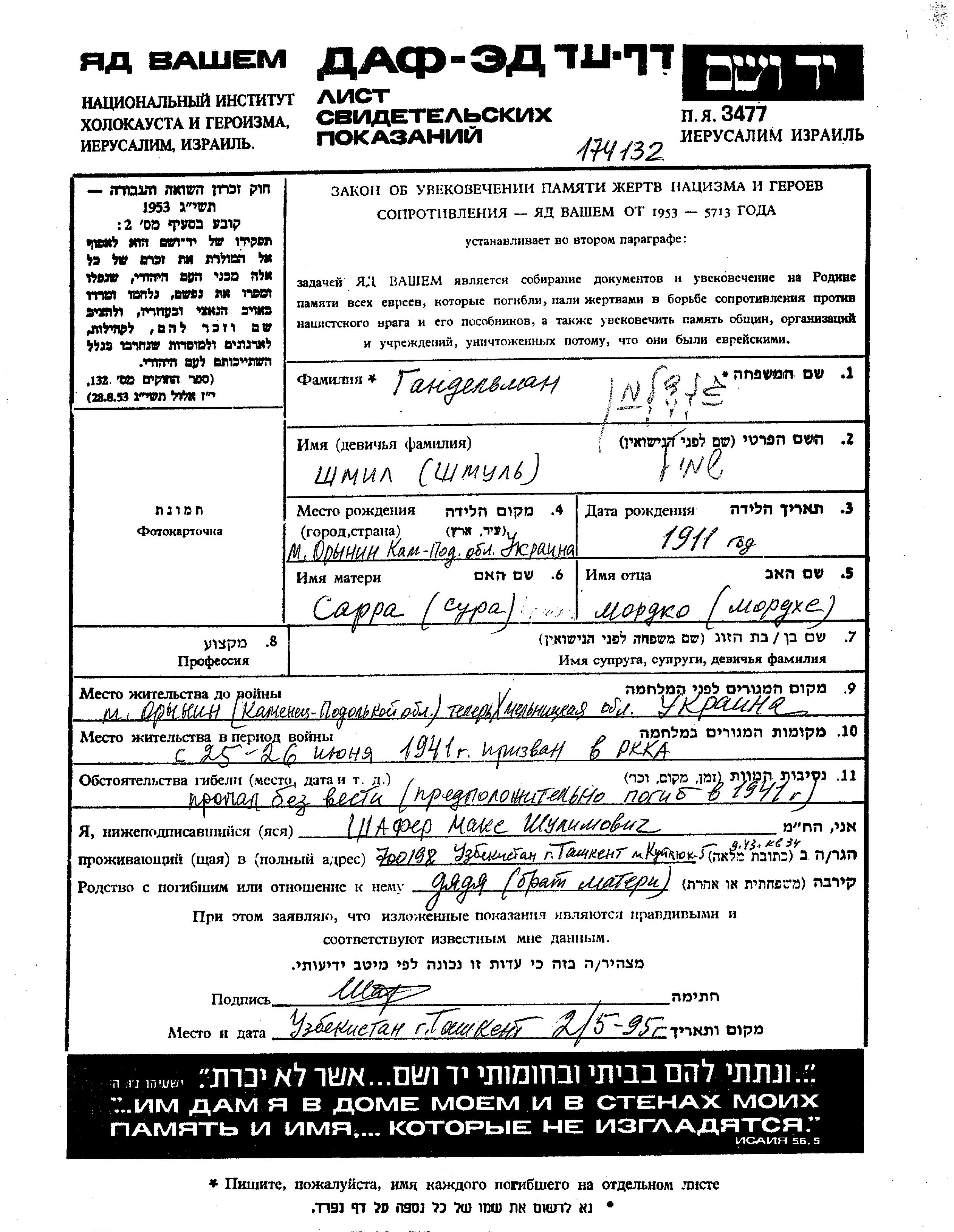 Гандельман Шмиль 1911 Оринин, Украина (СССР) Лист свидетельских показаний