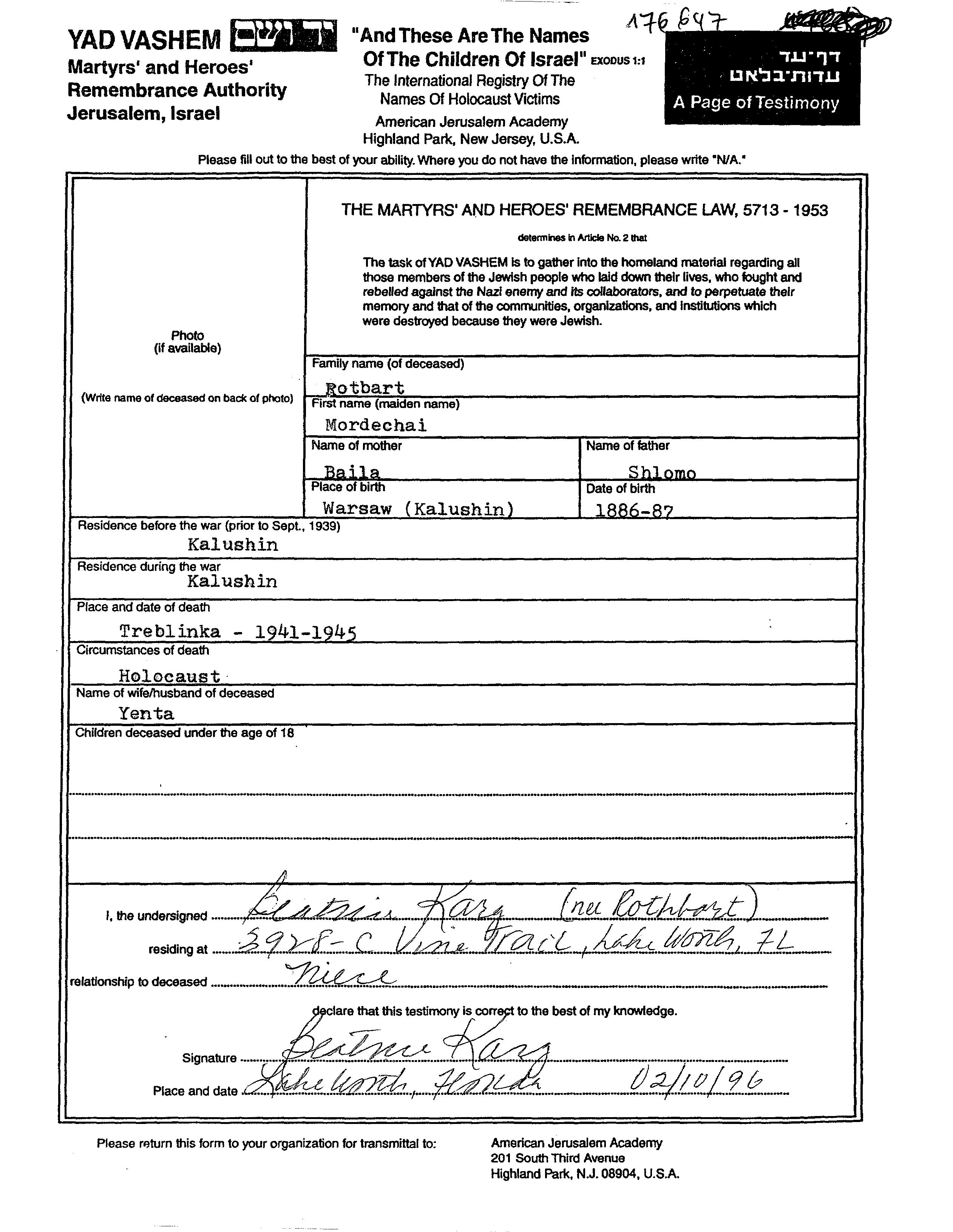 Мордехай Ротбарт, место рождения: Калушин, Польша. Отец: Шломо, mать:Баила. Женат / замужем. Место жительства до войны: Калушин, Польша. Место во время войны: Калушин, Польша.