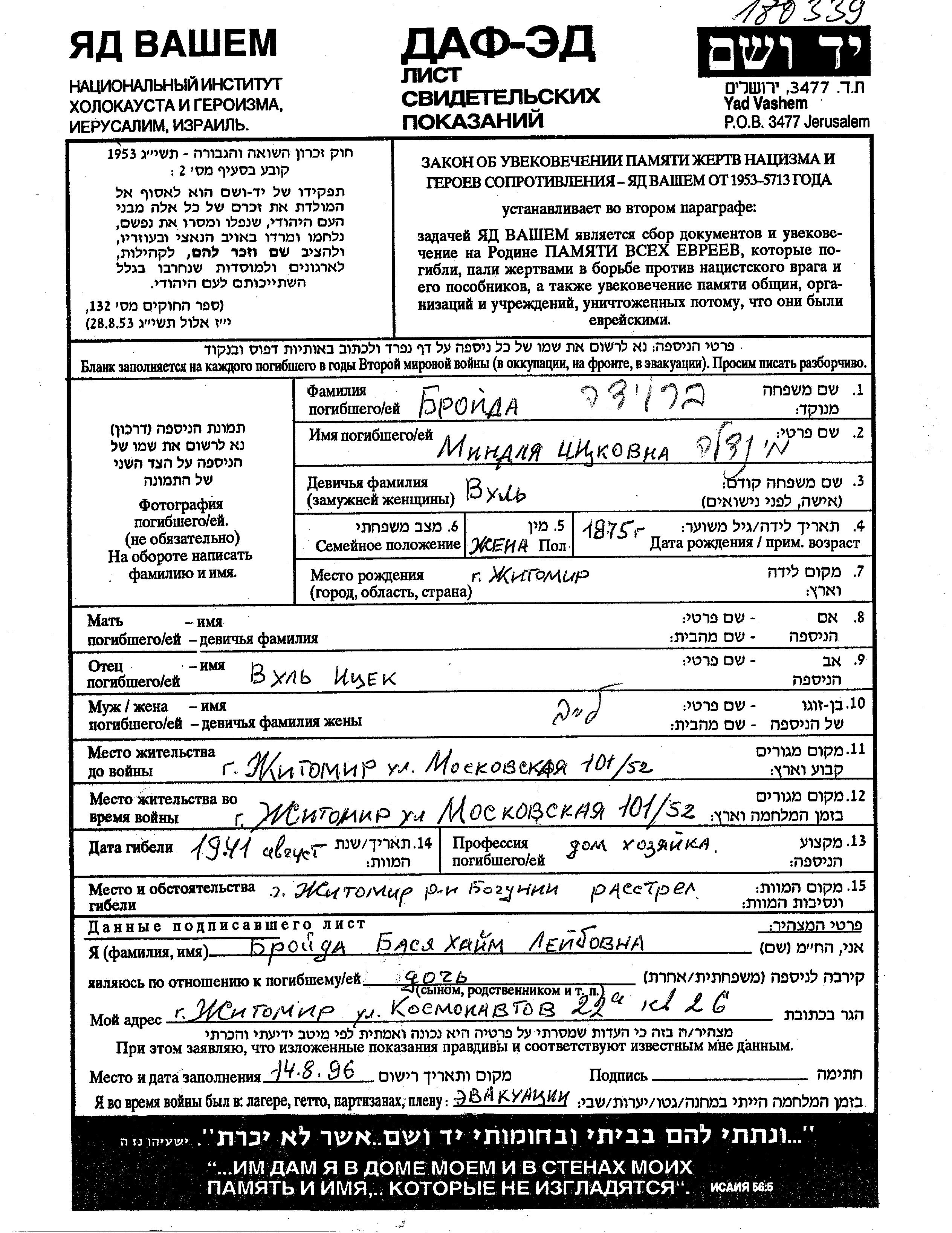 Миндля Бройда, девичья фамилия Воль, место рождения: Житомир, Украина (СССР). Отец: Ицек. Домохозяйка. Женат / замужем. Место жительства до войны: Житомир, Украина (СССР). Место во время войны: Житомир, Украина (СССР).