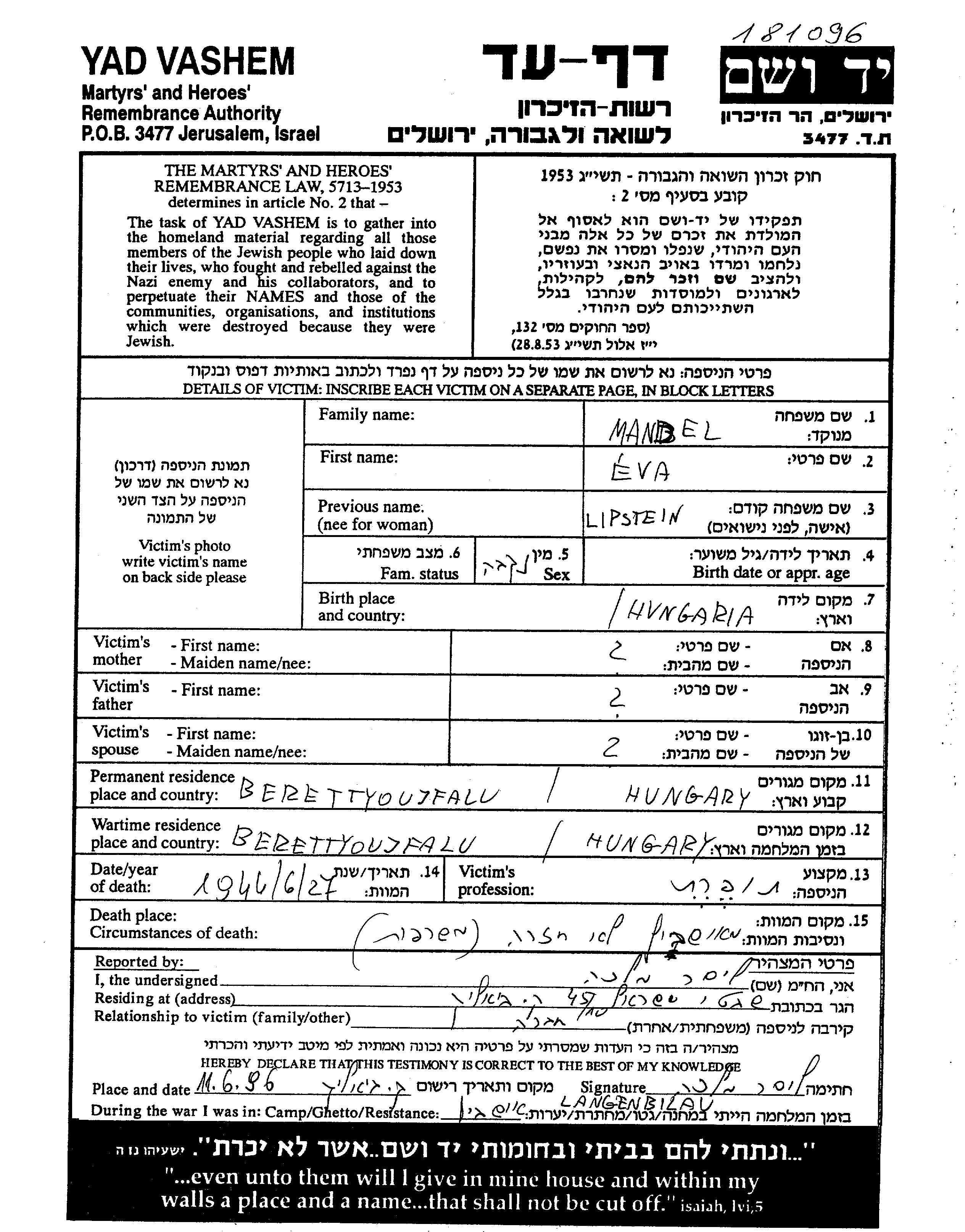Либштайн Мандель Эла Эва Тольд, Венгрия Лист свидетельских показаний