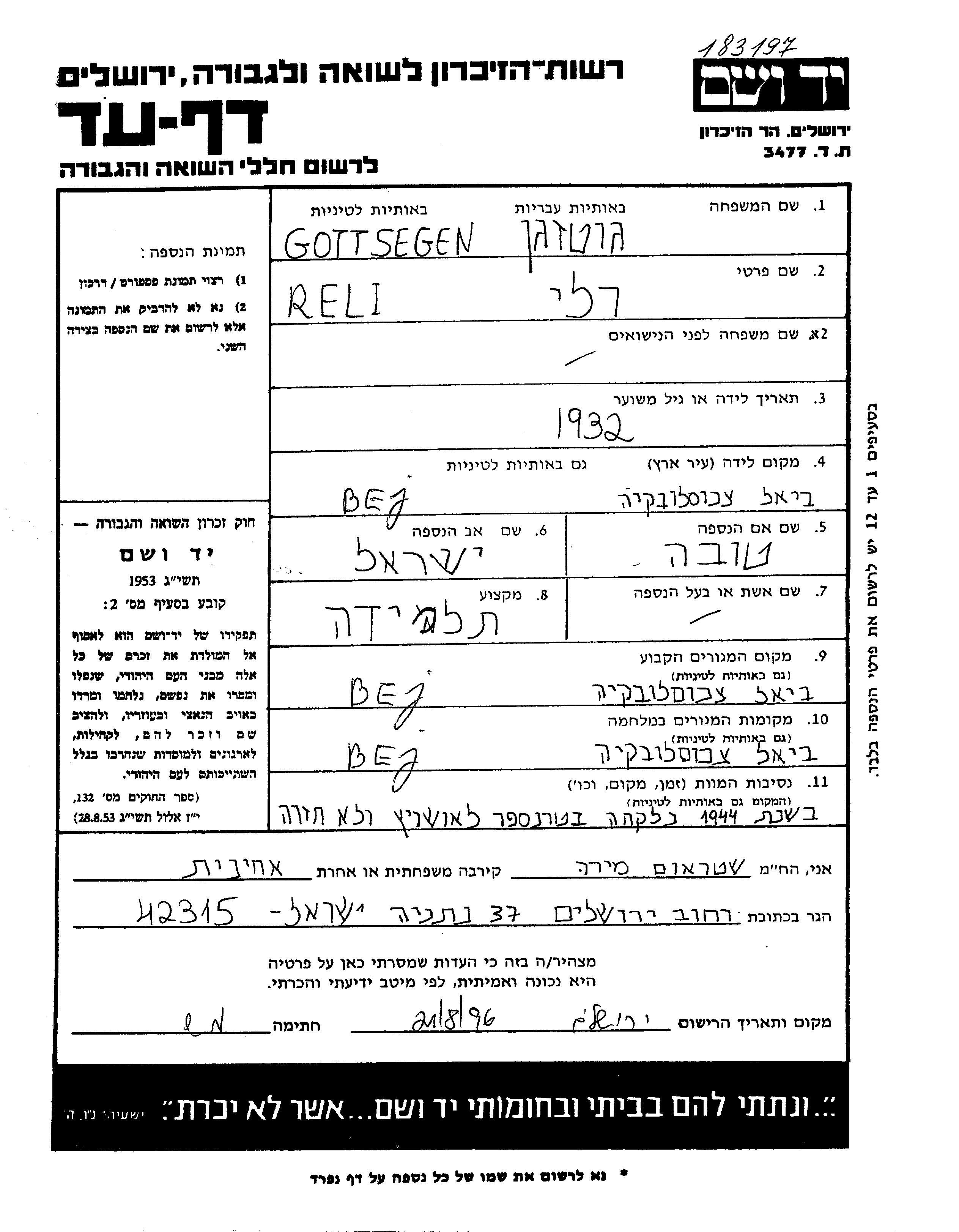 Рели Готтзеген, место рождения: Бьель, Чехословакия. Отец: Исраэль Изидор, mать:Това, девичья фамилия Виман. Ученик / ученица. Ребенок. Место жительства до войны: Бьель, Чехословакия. Место во время войны: Бьель, Чехословакия.