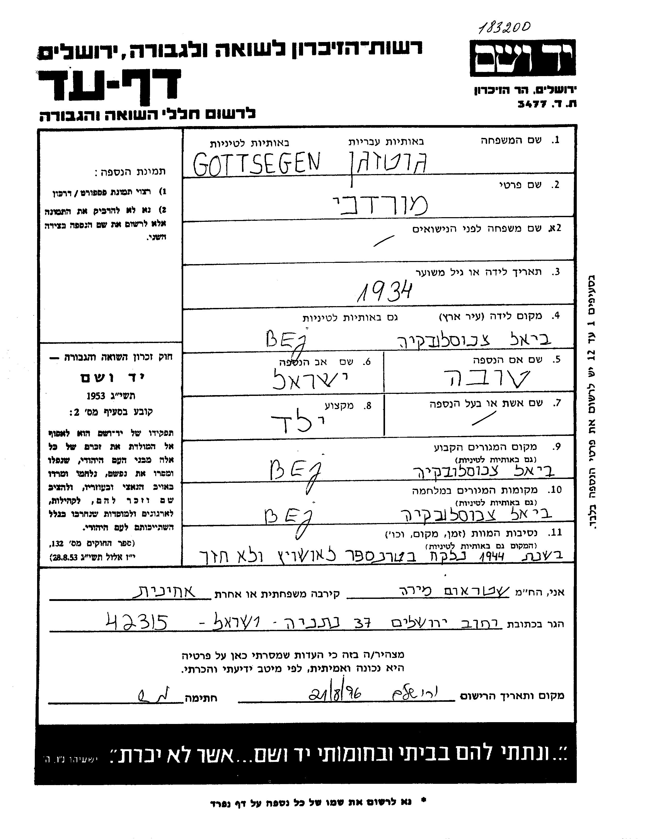 Мордехай Готтзеген, место рождения: Бьель, Чехословакия. Отец: Исраэль Изидор, mать:Това, девичья фамилия Виман. Ребенок. Место жительства до войны: Бьель, Чехословакия. Место во время войны: Бьель, Чехословакия.