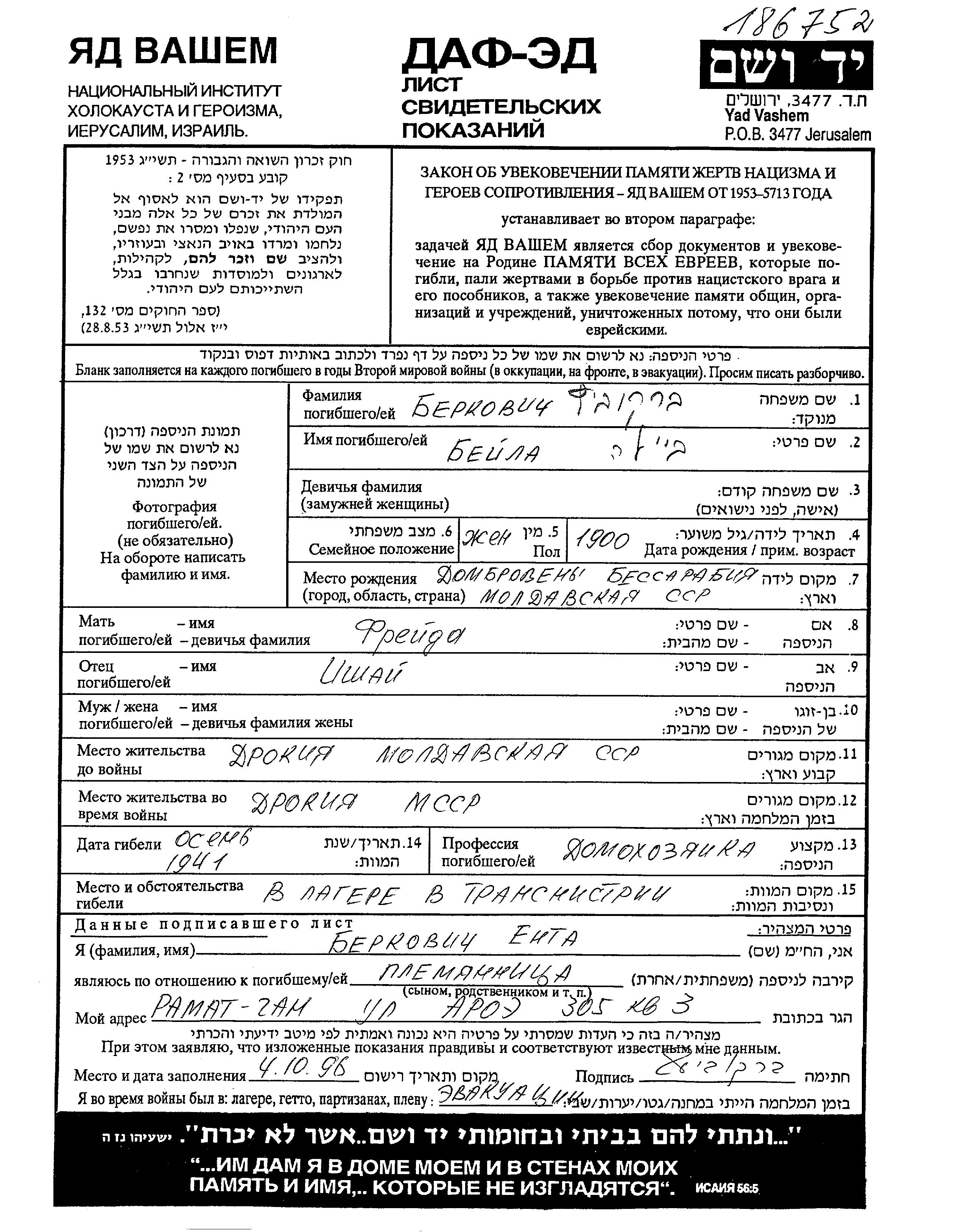 Бейла Беркович, место рождения: Dumbrăveni, Румыния. Отец: Ишай, mать:Фрейда. Домохозяйка. Место жительства до войны: Dumbrăveni, Румыния. Место во время войны: Dumbrăveni, Румыния.