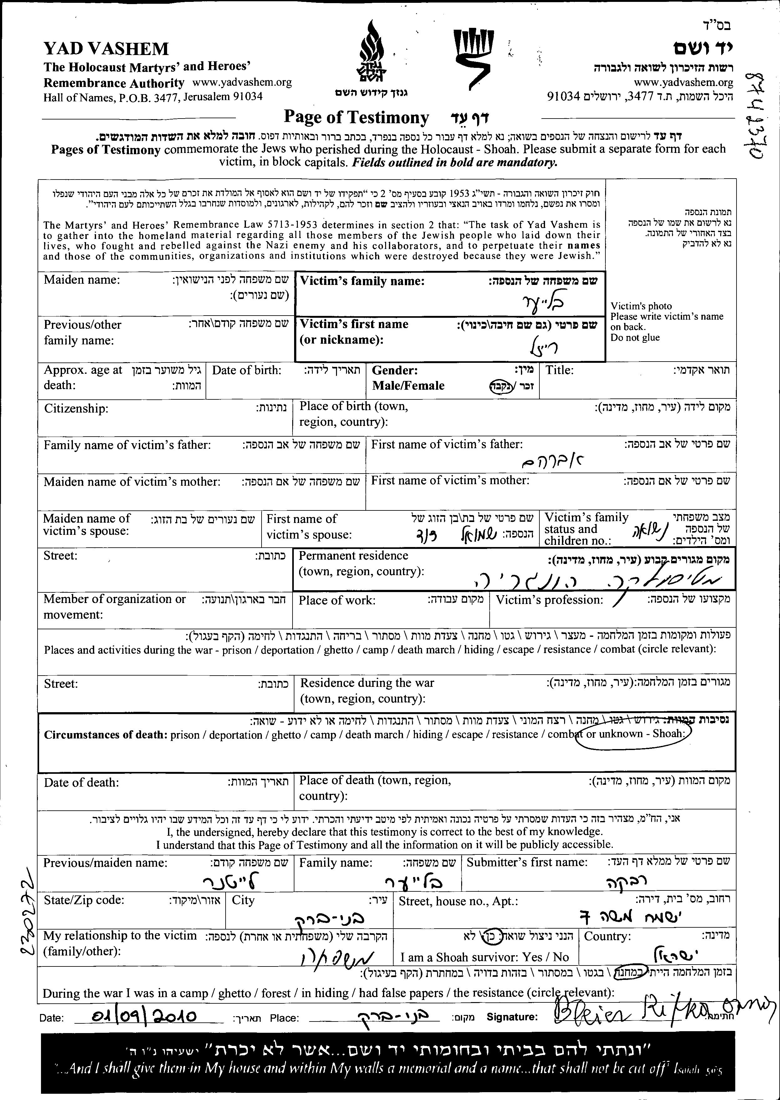 Яд Вашем - Листы свидетельских показаний Мемориального фонда