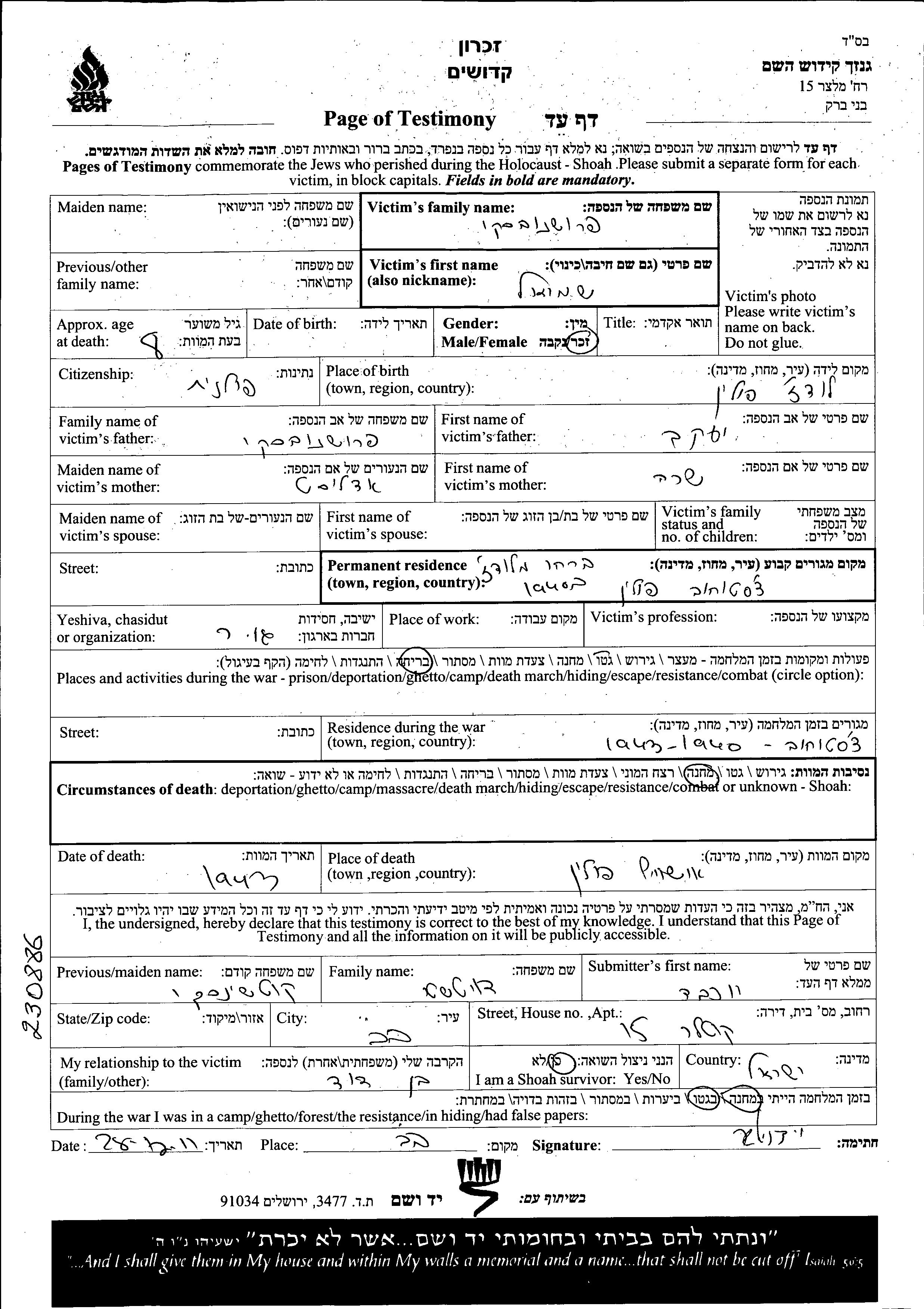 Шмуэль Прушановски, место рождения: Лодзь, Польша. Отец: Яков, mать:Сара, девичья фамилия Эделист. Ребенок. Место жительства до войны: Ченстохова, Польша. Место во время войны: Аушвиц, Польша.