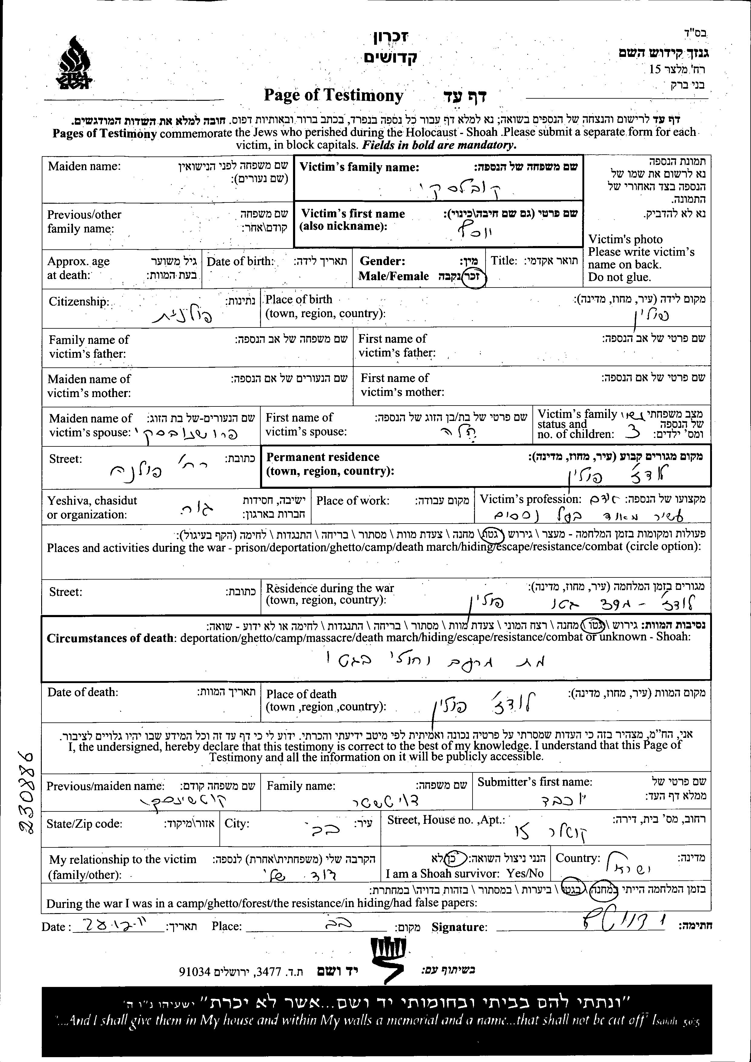 Яд Вашем - Листы свидетельских показаний Мемориального фонда