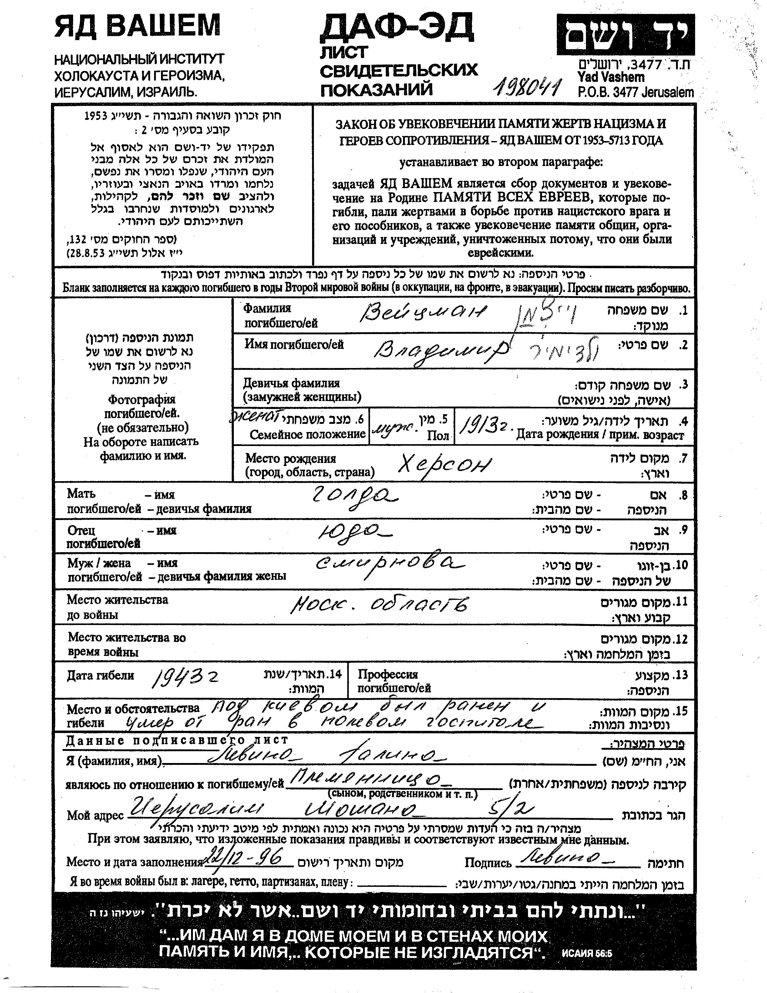 Вейцман Владимир 1913 Москва, Россия (СССР) Лист свидетельских показаний