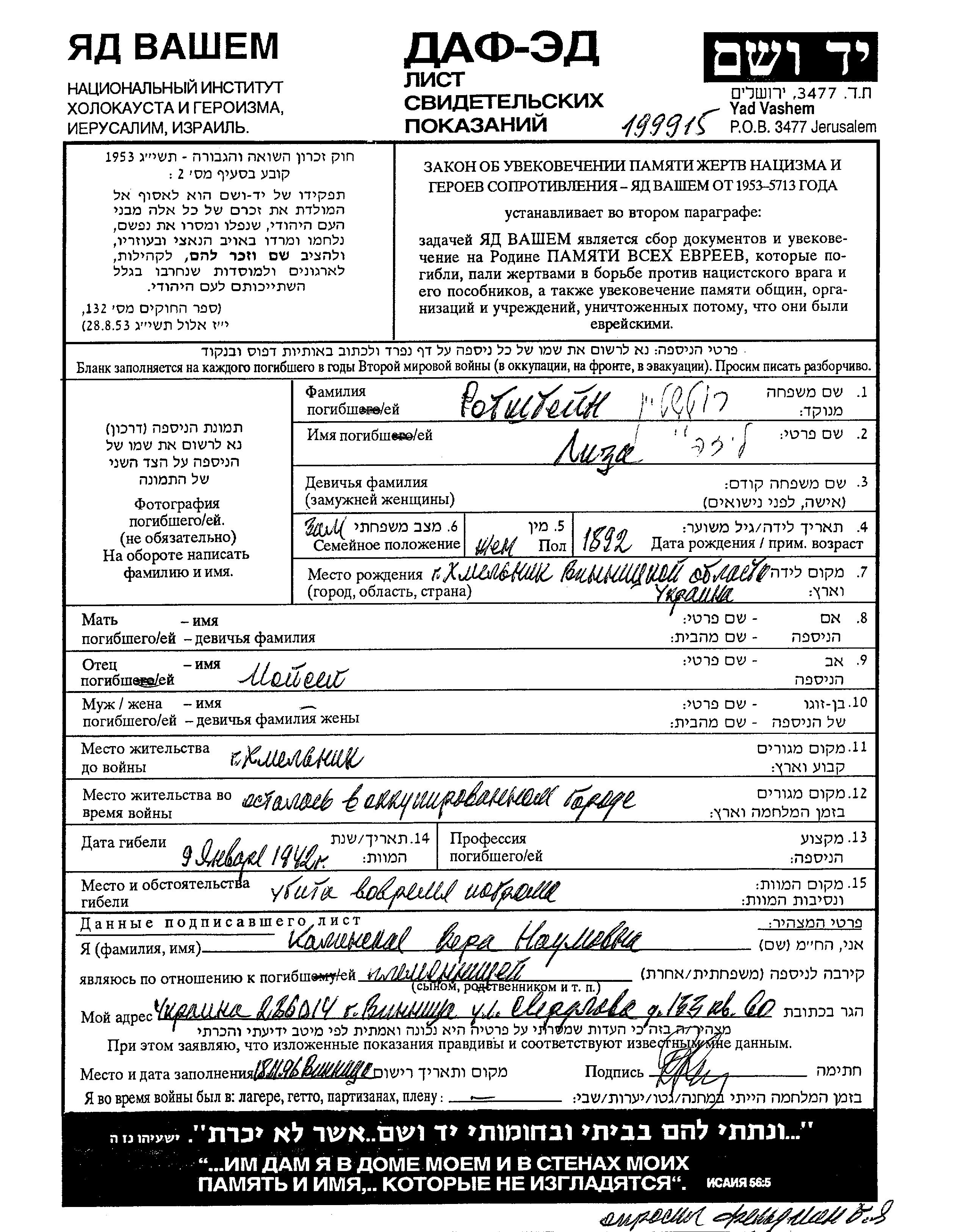 Яд Вашем - Листы свидетельских показаний Мемориального фонда