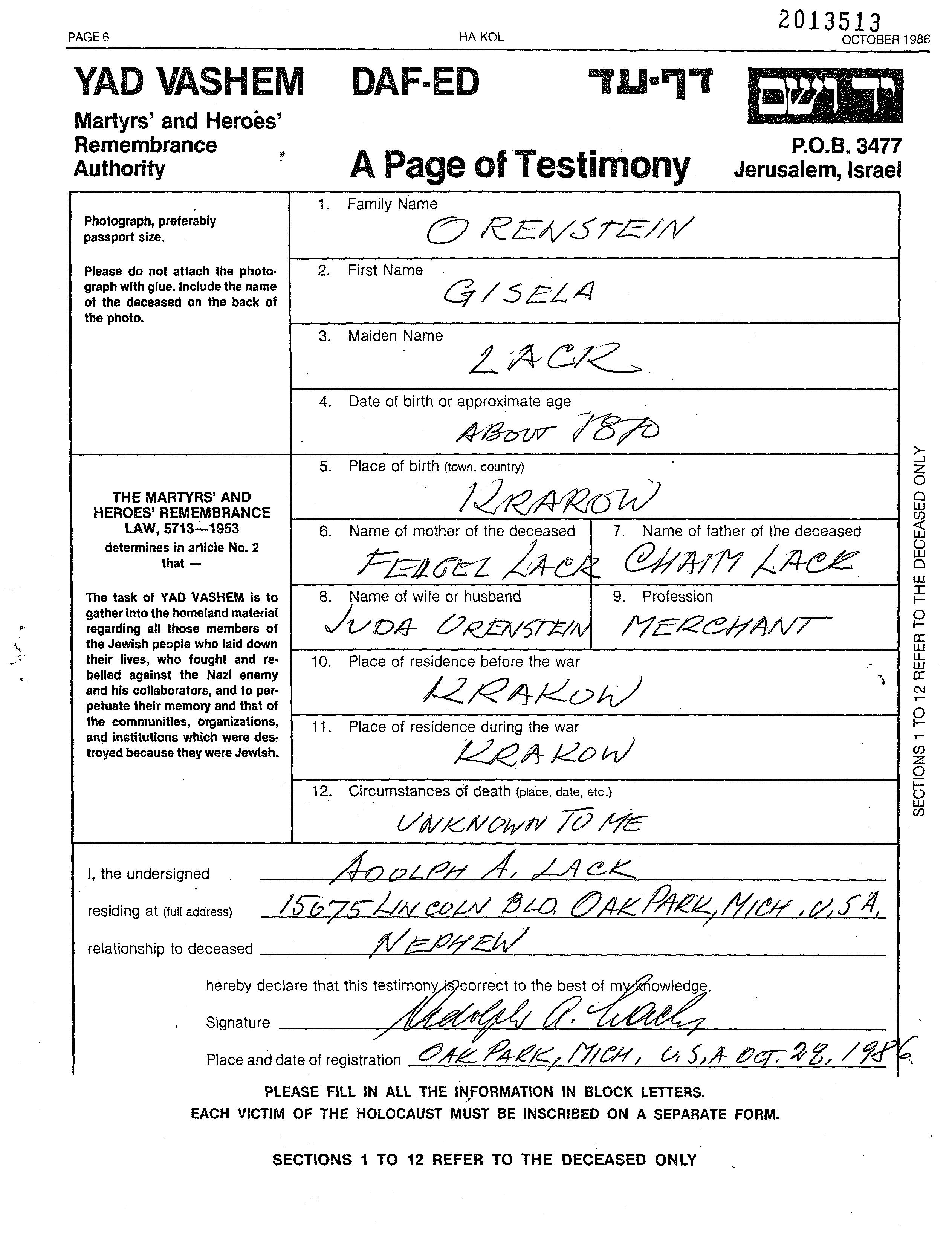 Гизела Оренштейн, девичья фамилия Лак, место рождения: Краков, Польша. Отец: Хаим, mать:Файгель. Торговец / торговка. Женат / замужем. Место жительства до войны: Краков, Польша. Место во время войны: Краков, Польша.