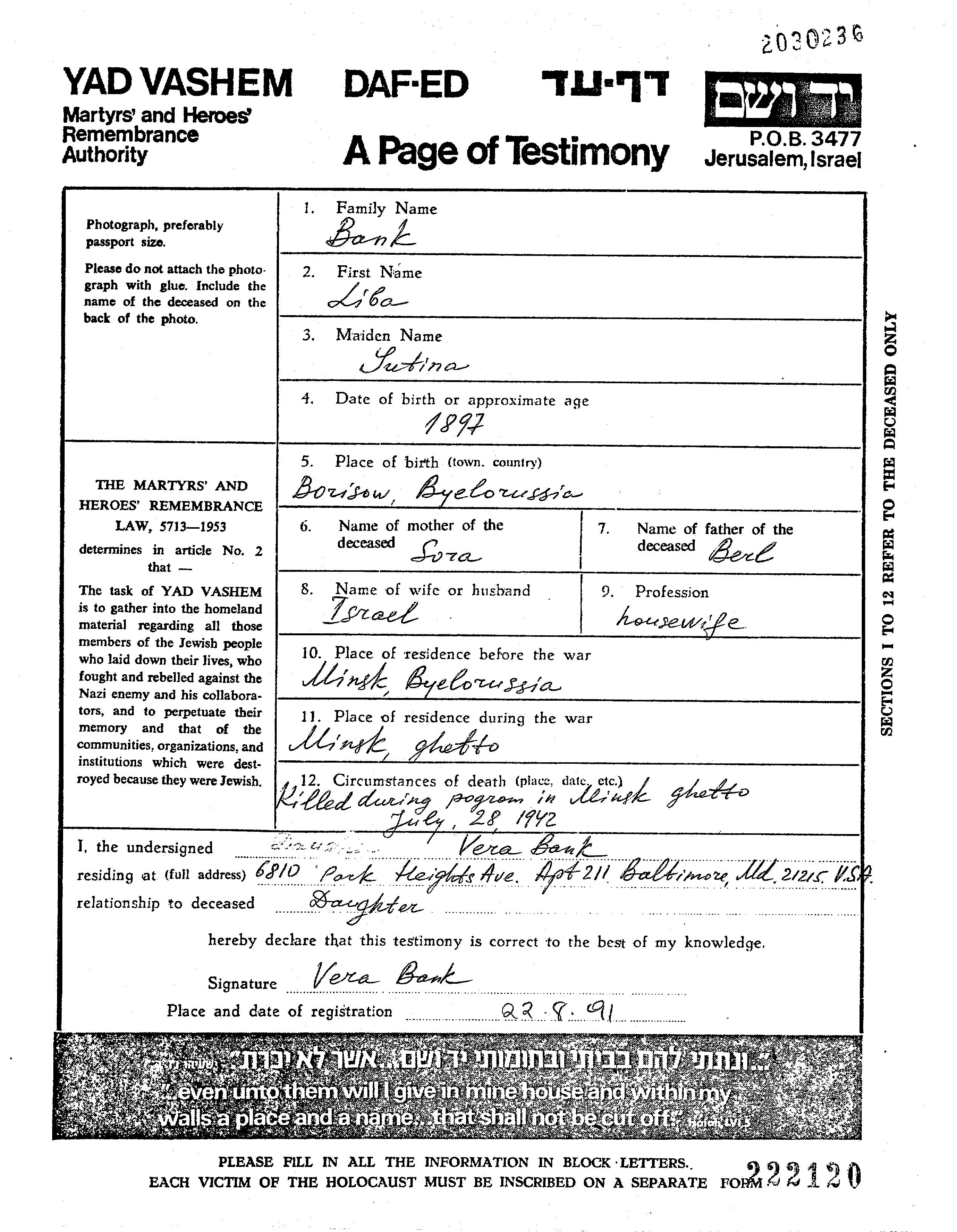 Либа Банк, девичья фамилия Гутин, место рождения: Борисов, Белоруссия (СССР). Отец: Берл, mать:Сора. Домохозяйка. Женат / замужем. Место жительства до войны: Минск, Белоруссия (СССР). Место во время войны: Минск, Белоруссия (СССР).