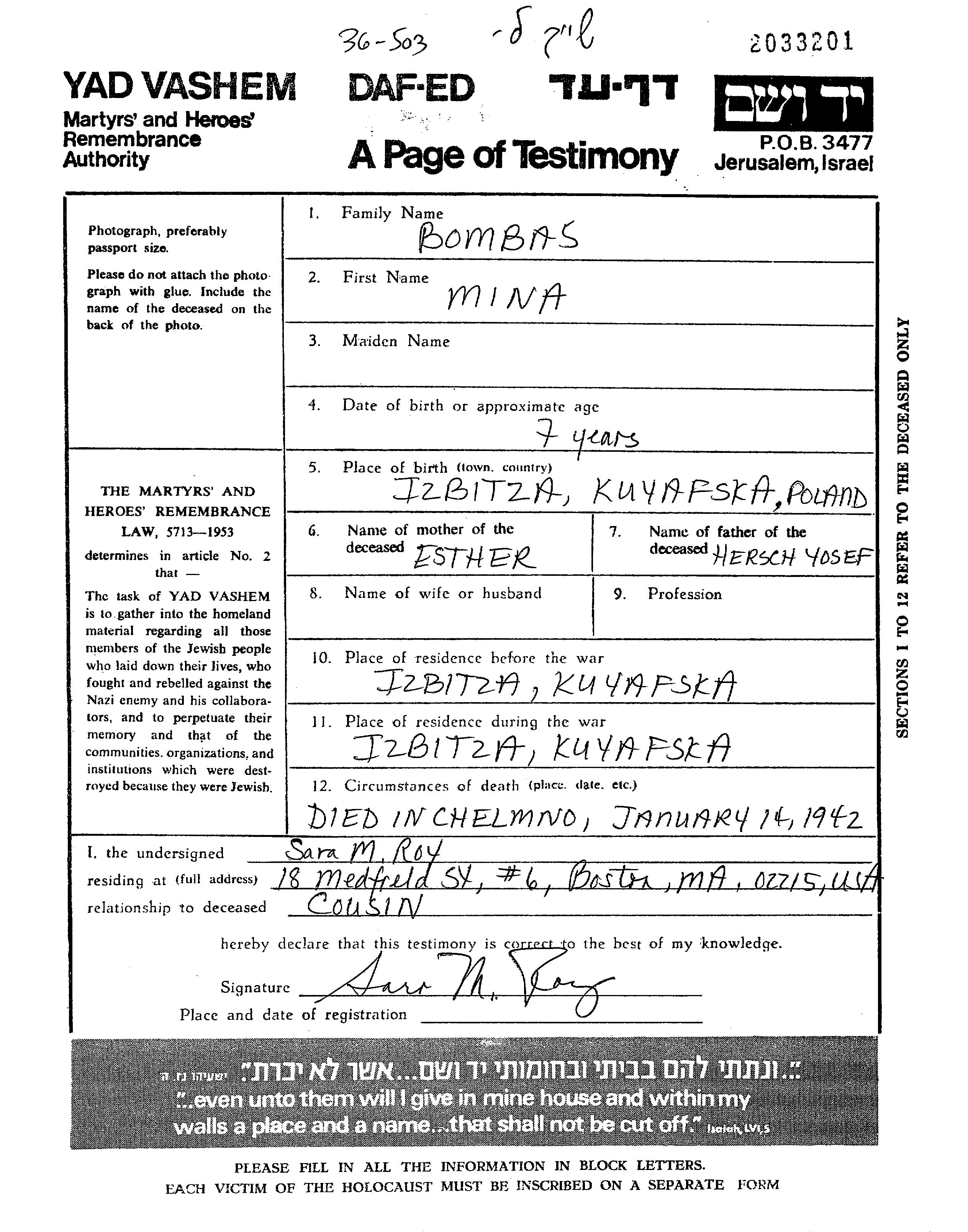 Мина Бомбас, место рождения: Избица-Куявска, Польша. Отец: Герш Иосеф, mать:Эстер, девичья фамилия Фрейлих. Ребенок. Место жительства до войны: Избица-Куявска, Польша. Место во время войны: Избица-Куявска, Польша.