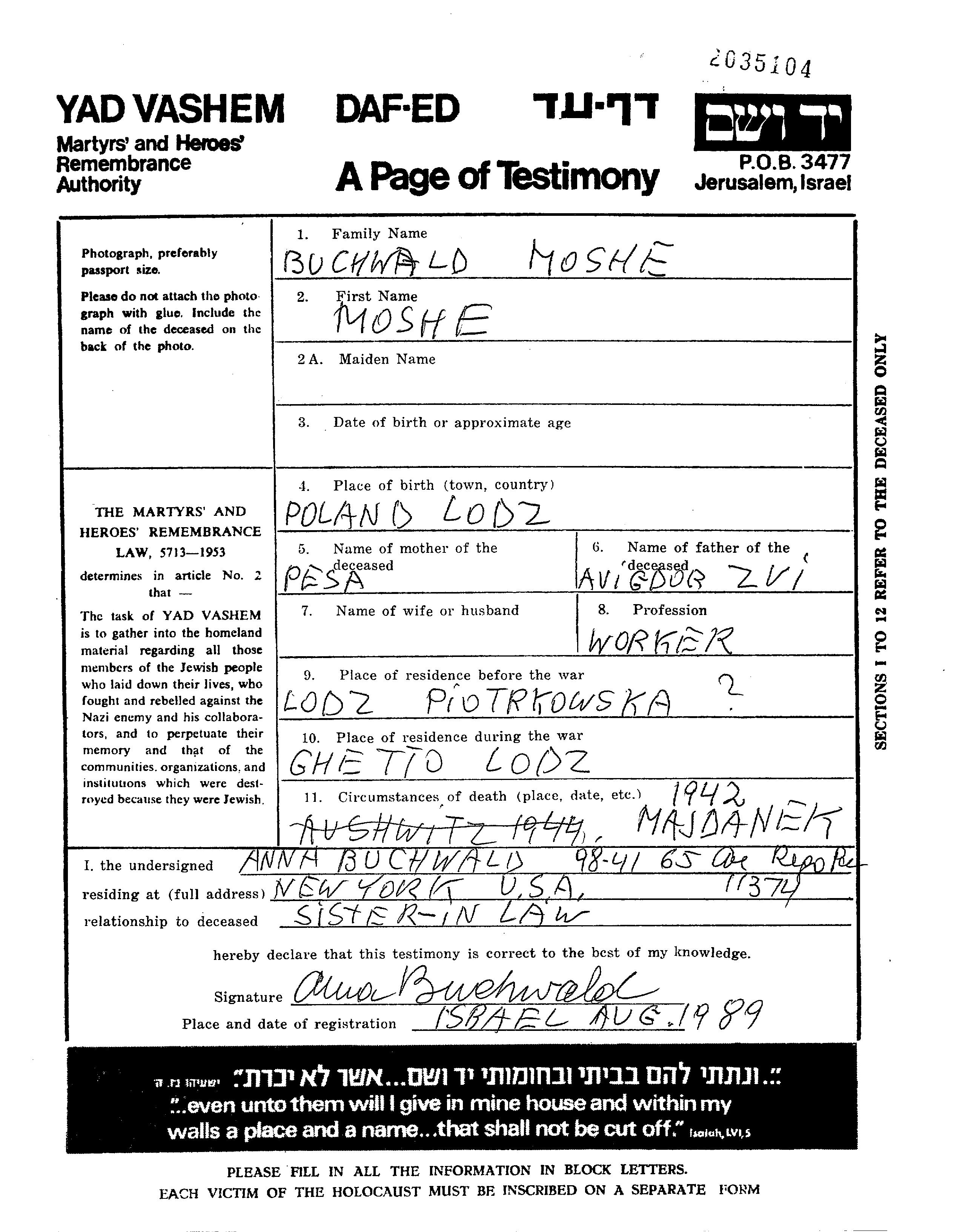 Бухвальд Моше Лодзь, Польша Лист свидетельских показаний