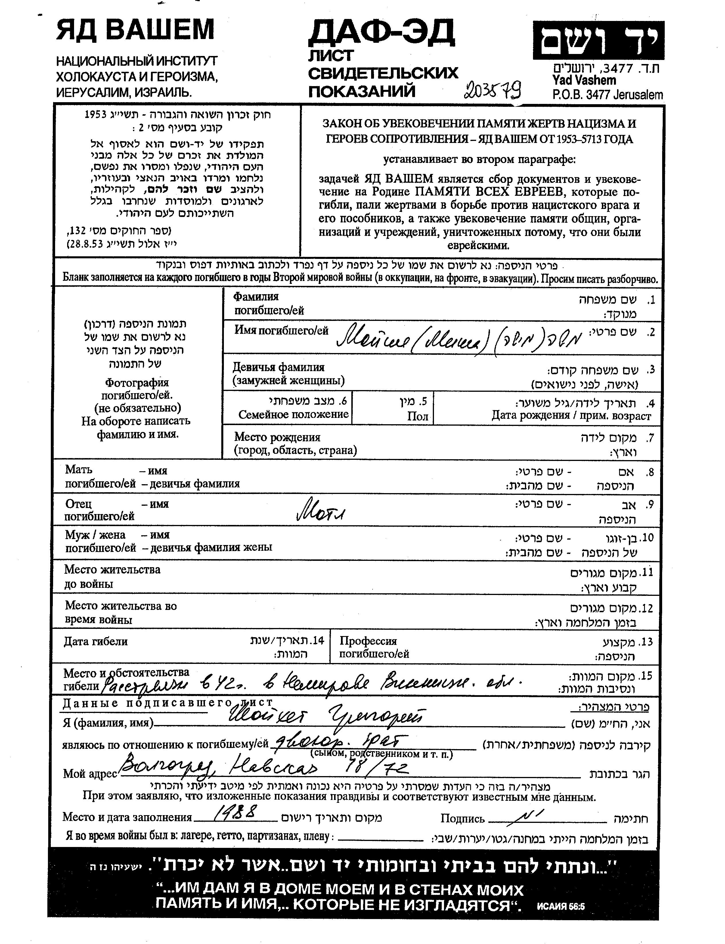 Яд Вашем - Листы свидетельских показаний Мемориального фонда