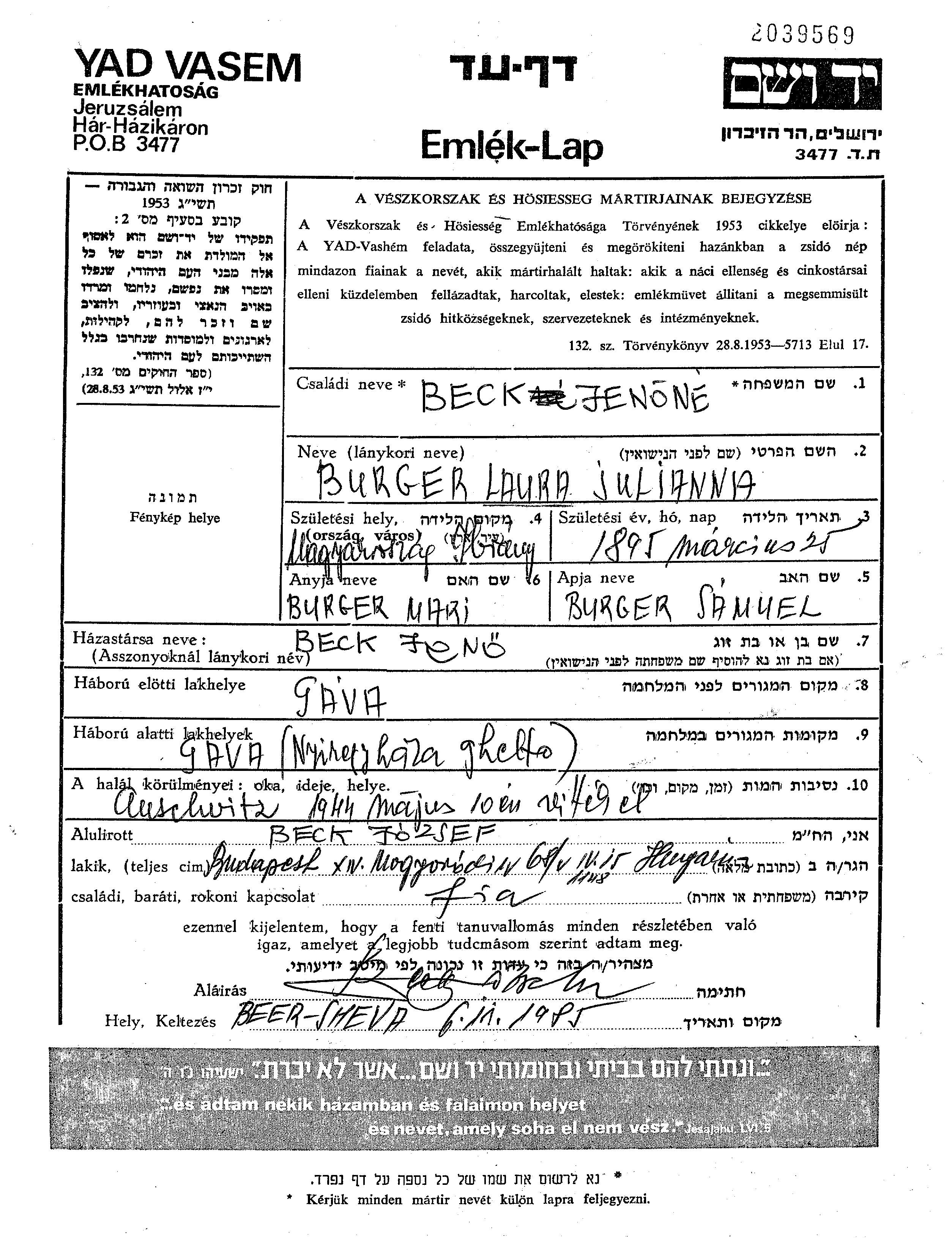 Юлианна Лаура Бек, девичья фамилия Бургер, место рождения: Ибрань, Венгрия. Отец: Шмуэль, mать:Мари. Женат / замужем. Место жительства до войны: Гава, Венгрия. Место во время войны: Гава, Венгрия.