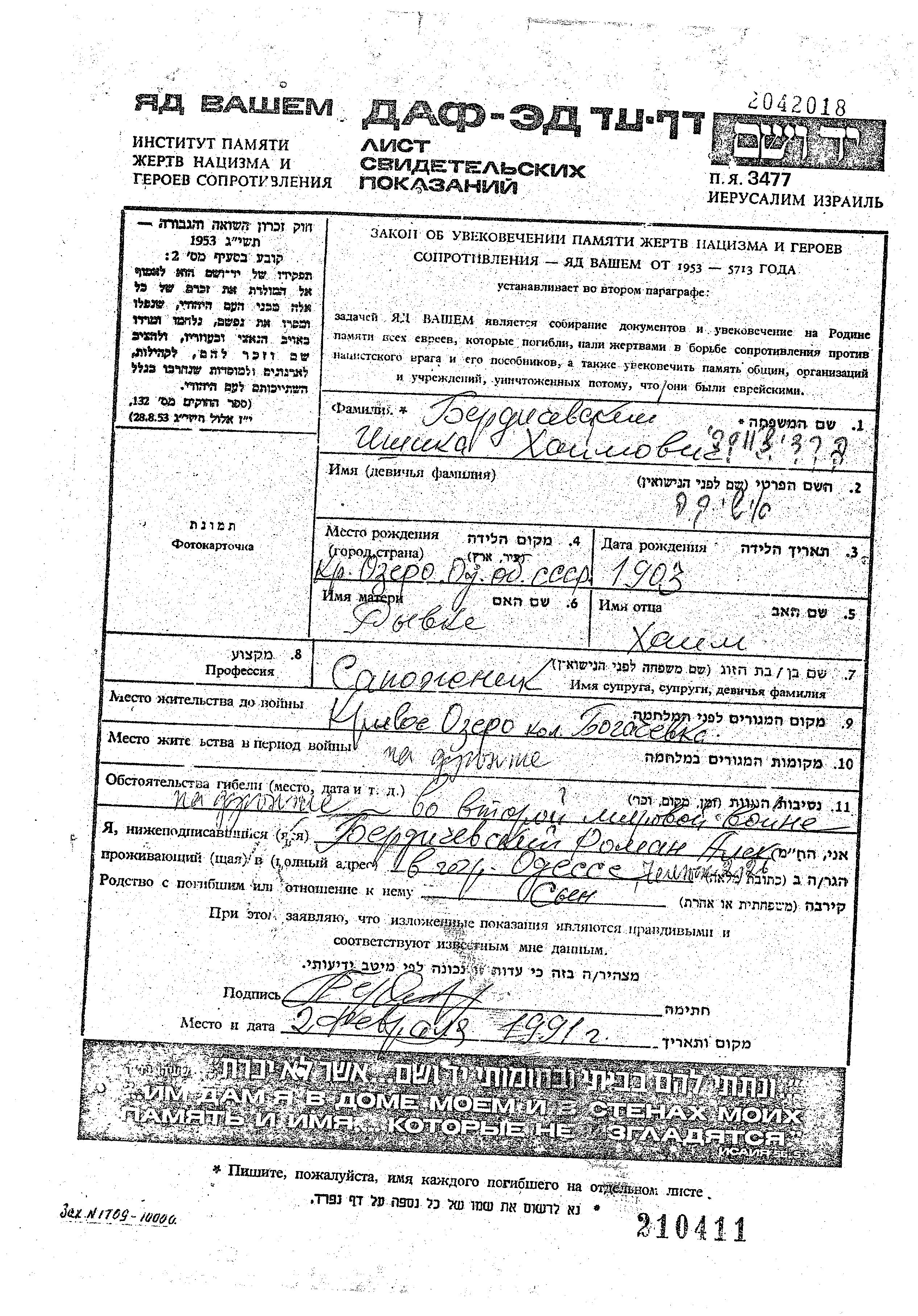 Бердичевский Ишика 1903 Кривое Озеро, Украина (СССР) Лист свидетельских показаний