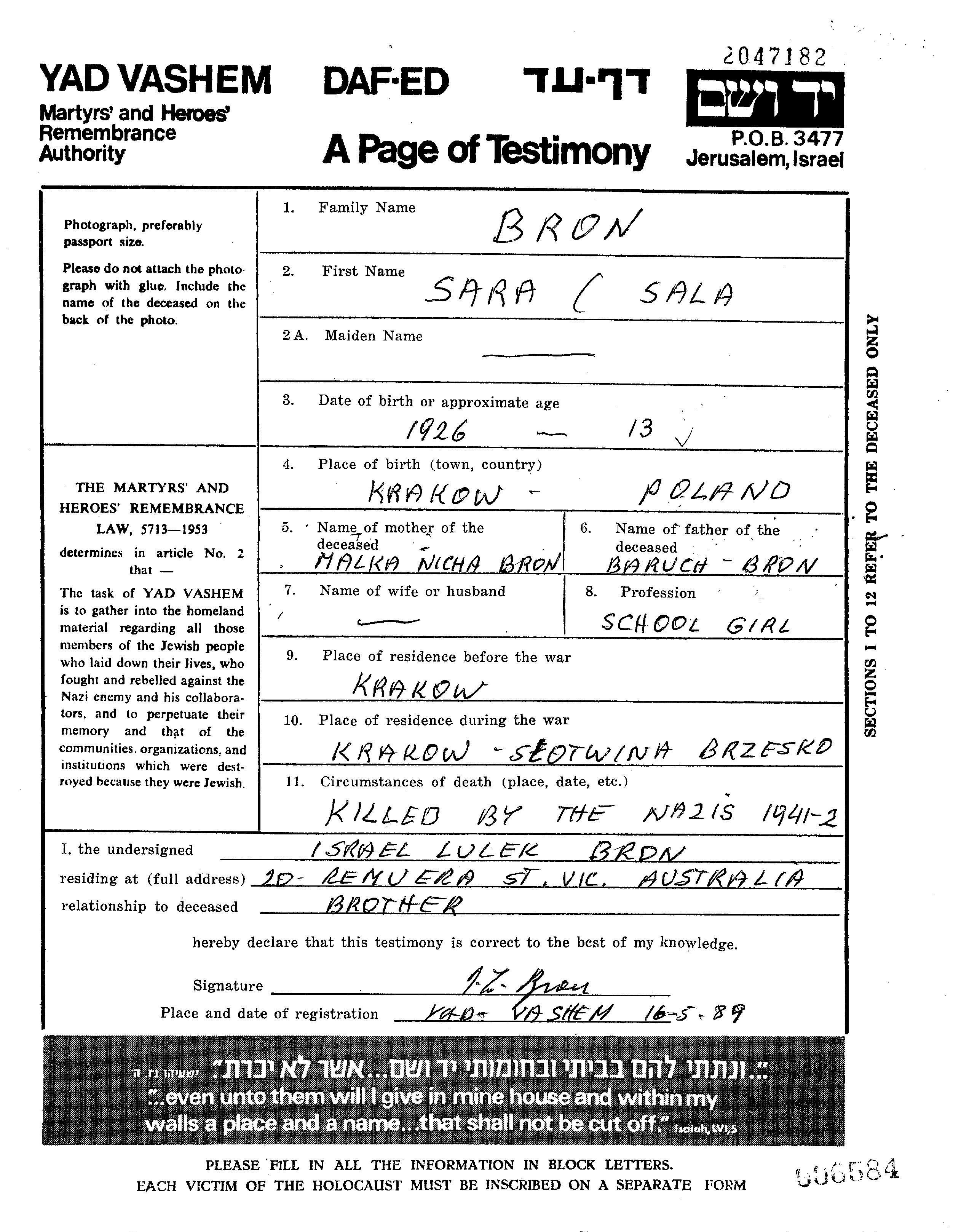 Сала Сара Брон Брун, место рождения: Краков, Польша. Отец: Барух, mать:Ниха Малка, девичья фамилия Биксер. Ученик / ученица. Ребенок. Место жительства до войны: Краков, Польша. Место во время войны: Слотвина, Польша.