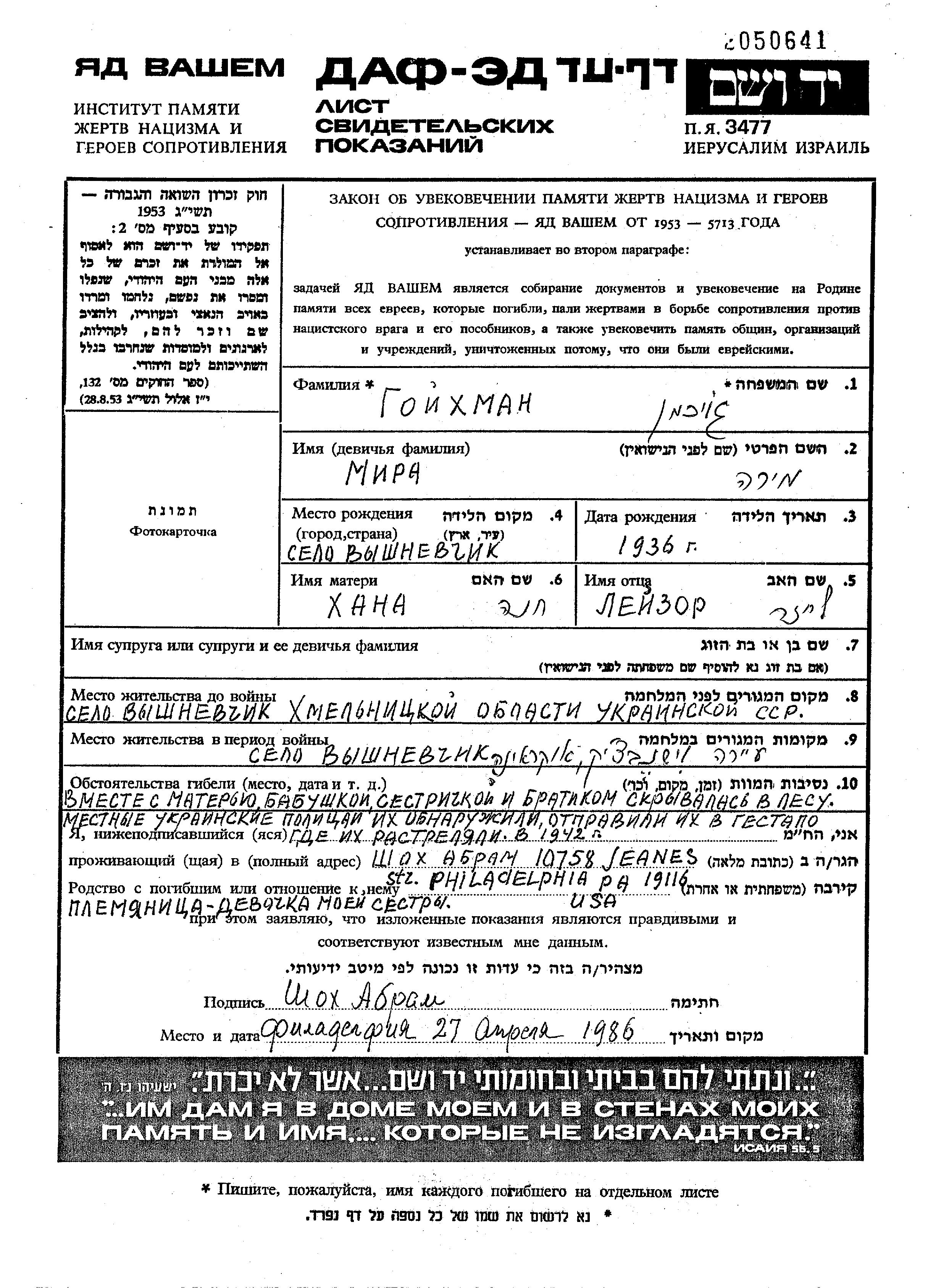 Во время Шоа евреев уничтожали разными способами: газовые камеры, расстрелы, их заживо хоронили или сжигали, непосильным принудительным трудом, голодом, эпидемиями, отсутствием минимальных гигиенических условий и медицинского обслуживания, и т.д. Некоторые евреи добровольно расстались со своей жизнью, чтобы избежать ареста и дальнейших преследований или чтобы покончить с безысходностью и бесконечными страданиями. Десятки тысяч еврейских солдат, служивших в Советской армии и попавших в плен, , были отобраны как евреи и убиты. Многие были зарегистрированы как «пропавшие без вести».