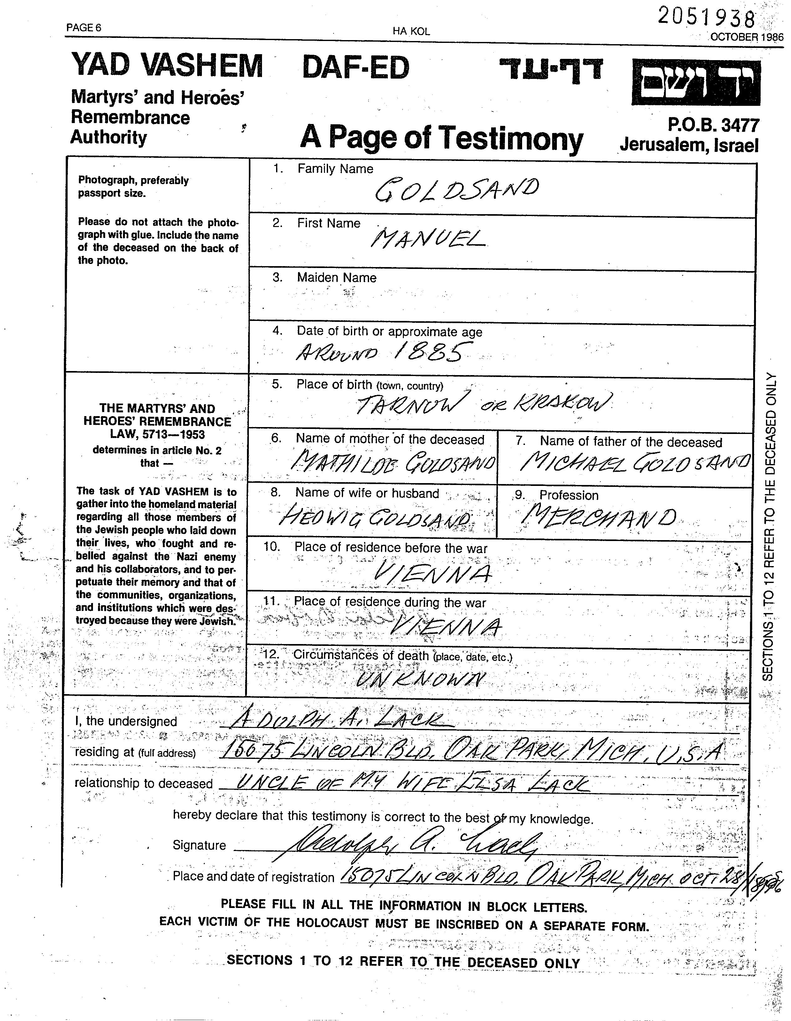 Мануэль Гольдзанд, место рождения: Тарнув, Польша. Отец: Михаэль, mать:Матильде. Торговец / торговка. Женат / замужем. Место жительства до войны: Вена, Австрия. Место во время войны: Вена, Австрия.