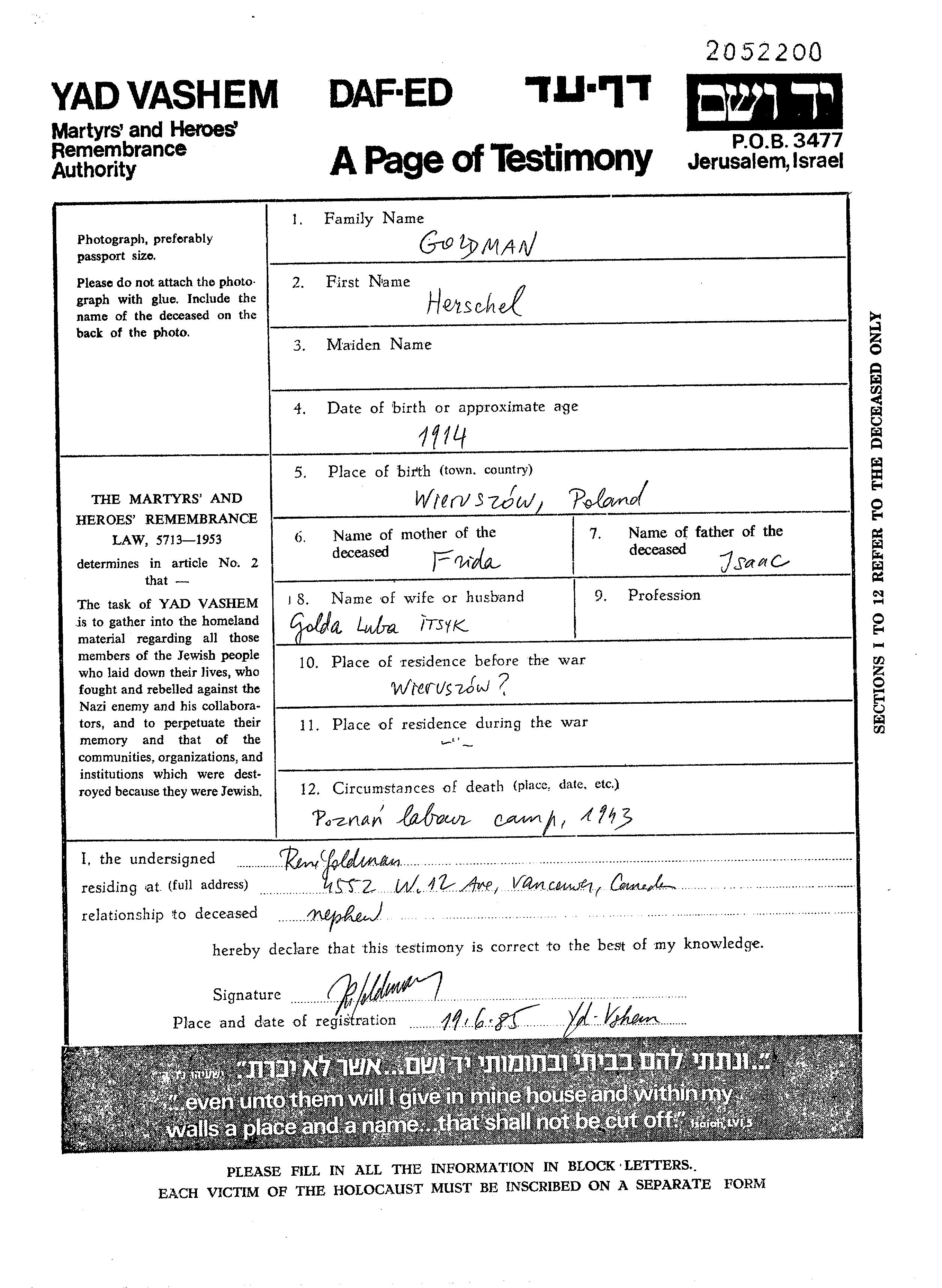 Хершель Гольдман, место рождения: Верушув, Польша. Отец: Исаак, mать:Фрида. Женат / замужем. Место жительства до войны: Верушув, Польша. Место во время войны: Верушув, Польша.