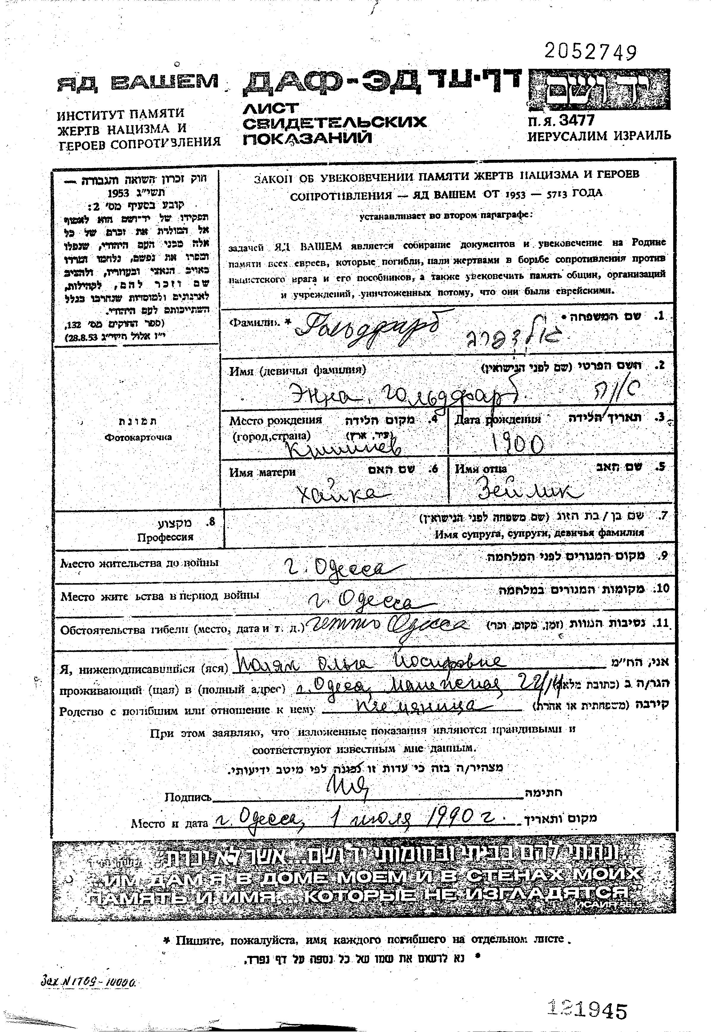 Гольдфарб Эна 1900 Одесса, Украина (СССР) Лист свидетельских показаний
