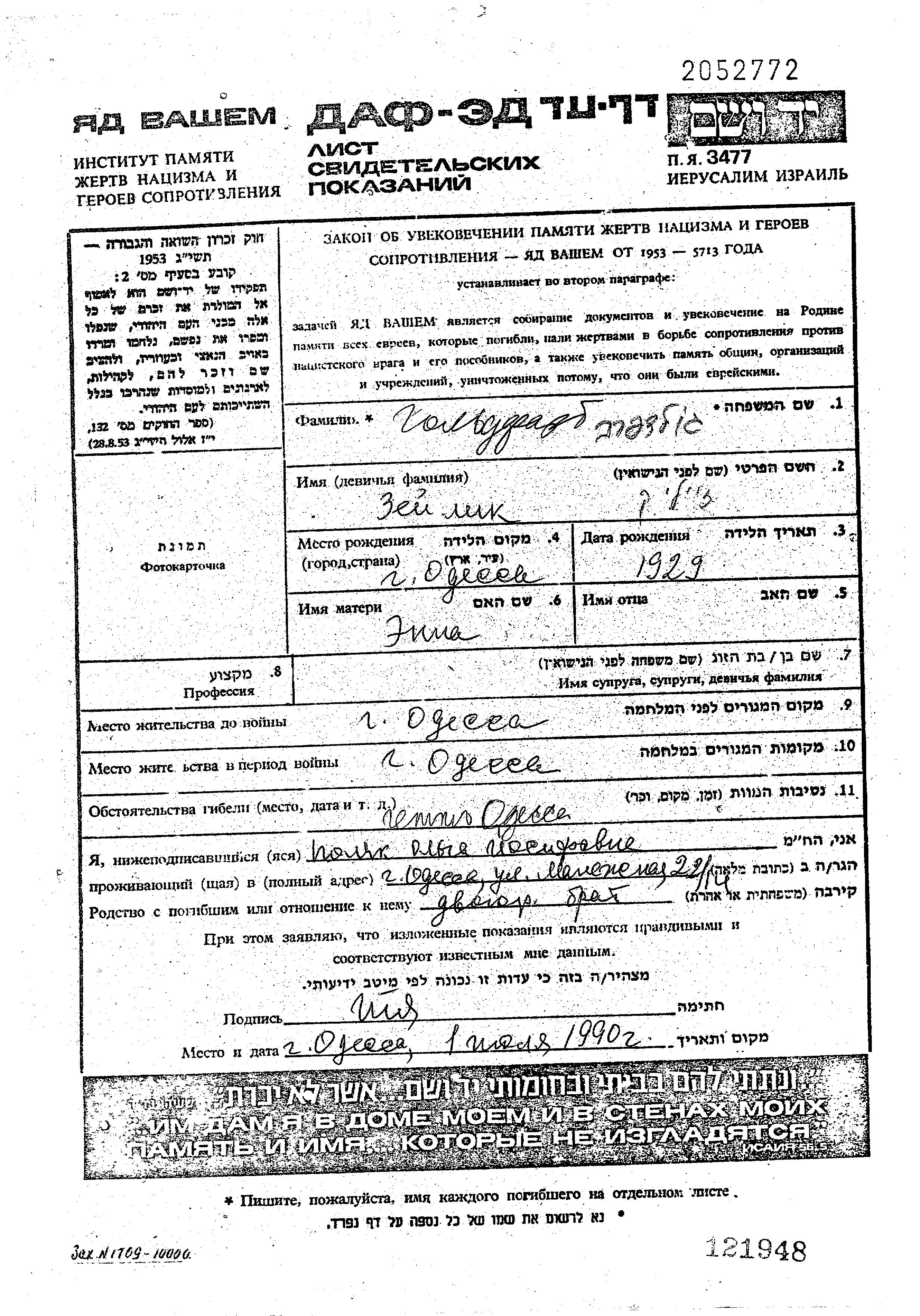 Яд Вашем - Листы свидетельских показаний Мемориального фонда