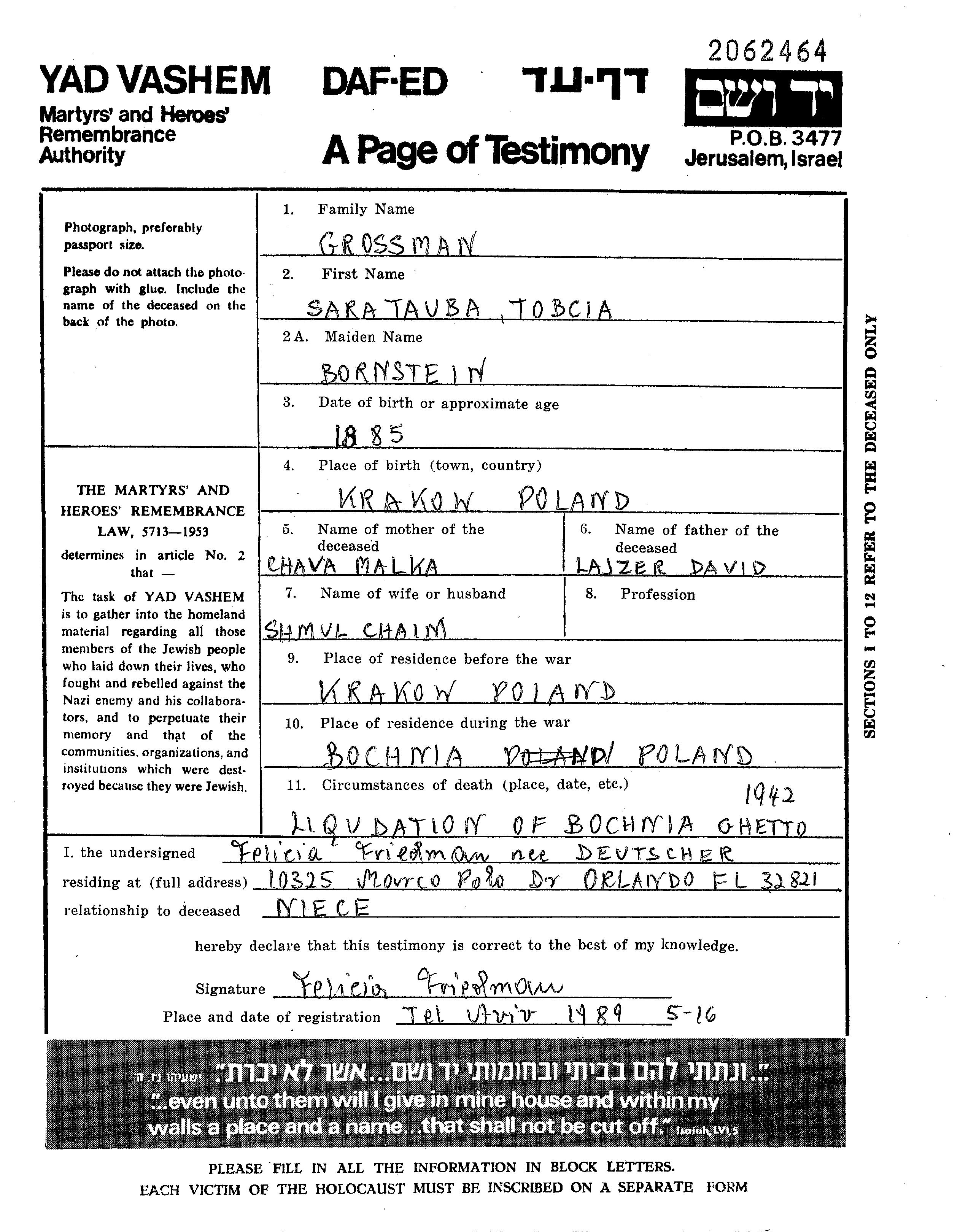 Тобча Сара Гроссман, девичья фамилия Борнштейн, место рождения: Краков, Польша. Отец: Лайзер Давид, mать:Хава Малка. Женат / замужем. Место жительства до войны: Краков, Польша. Место во время войны: Бохня, Польша.