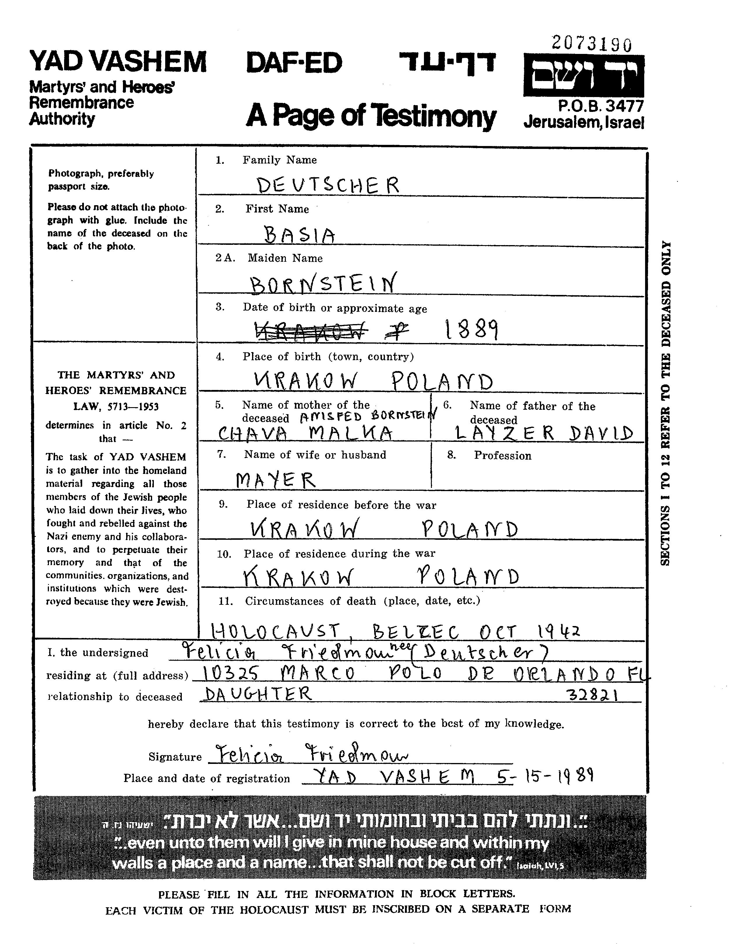 Дойчер Бася 1889 Краков, Польша Лист свидетельских показаний