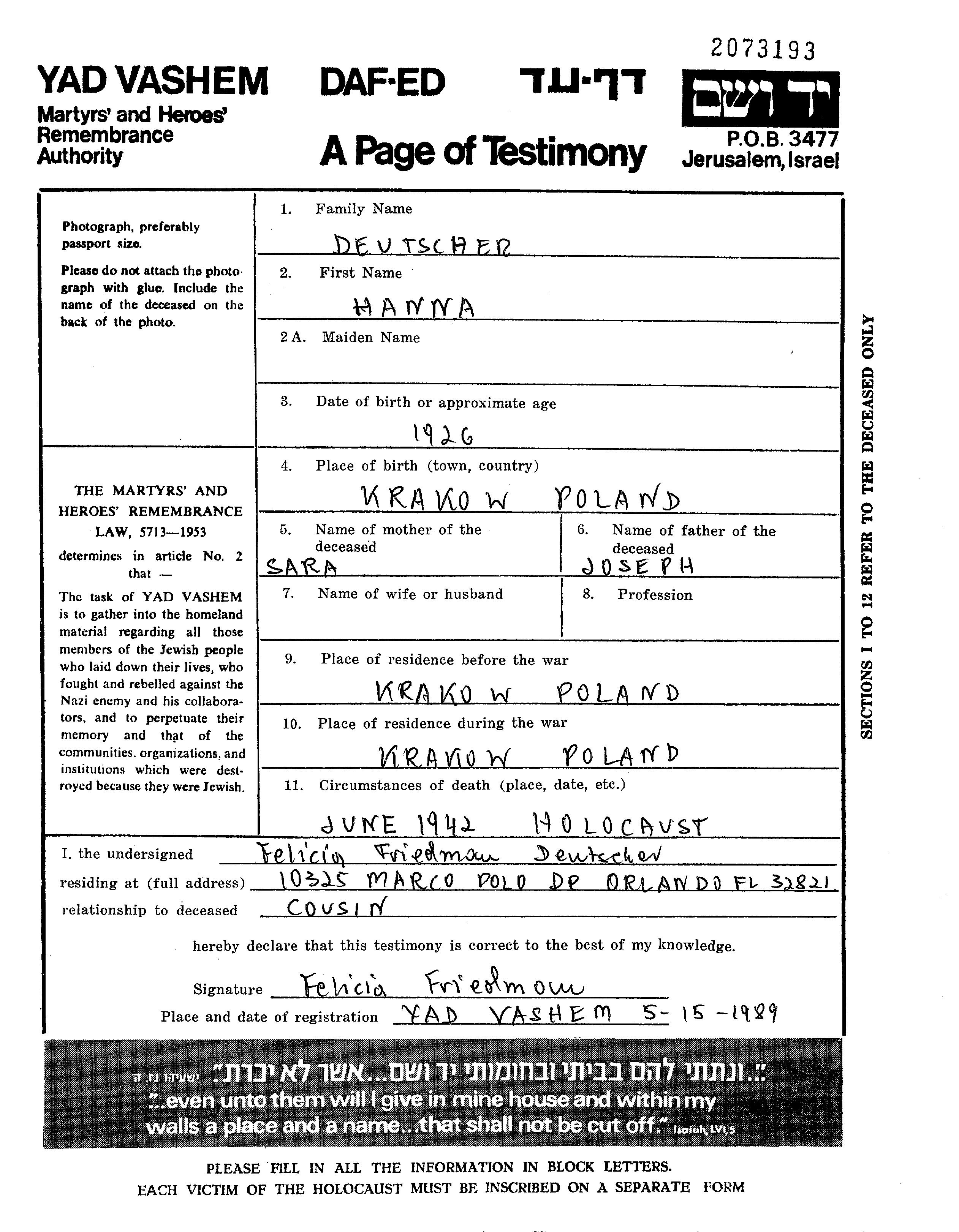 Дойчер Ханна 1926 Краков, Польша Лист свидетельских показаний