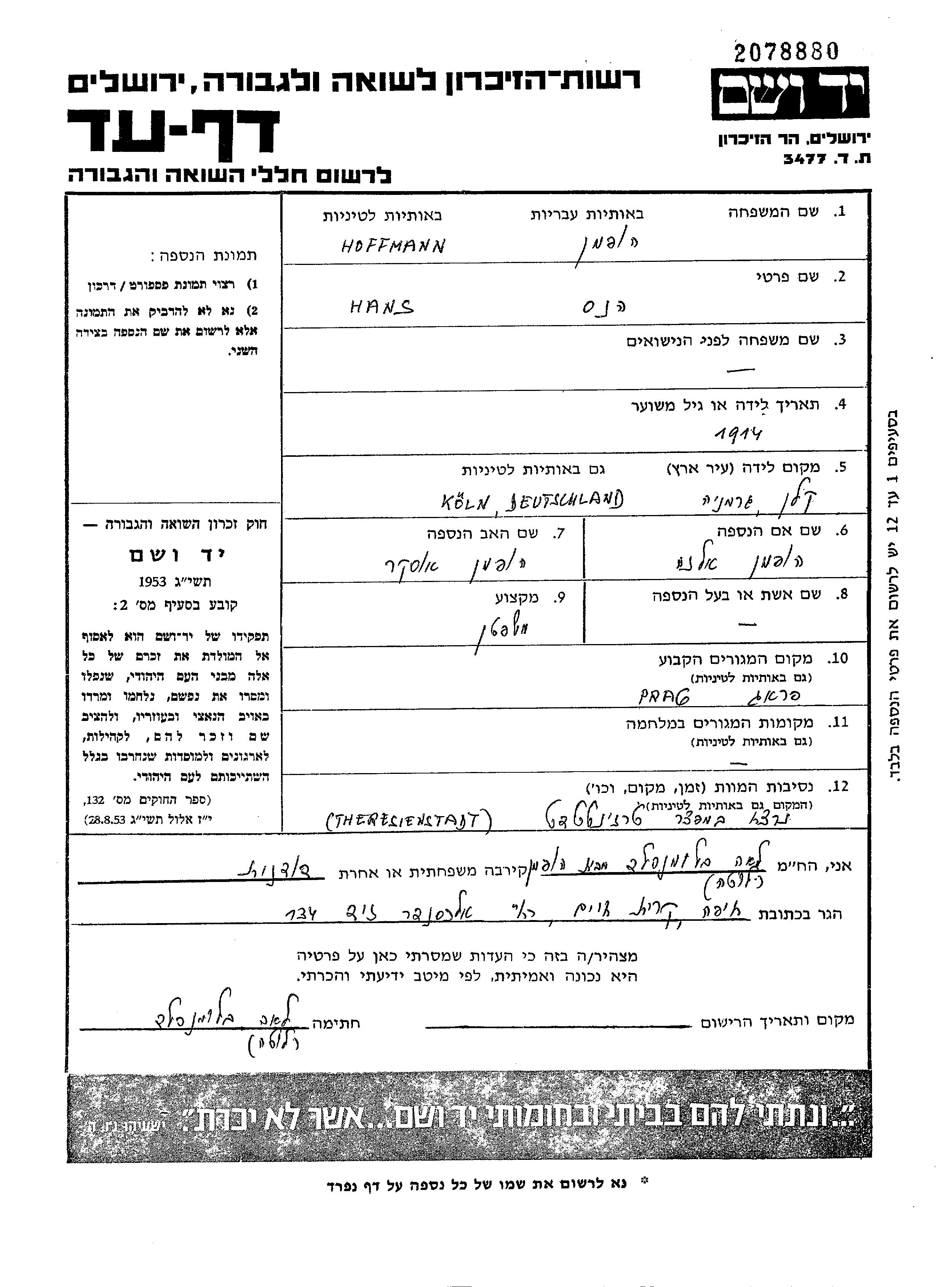 Хоффманн Ханс 1914 Прага, Чехословакия Лист свидетельских показаний