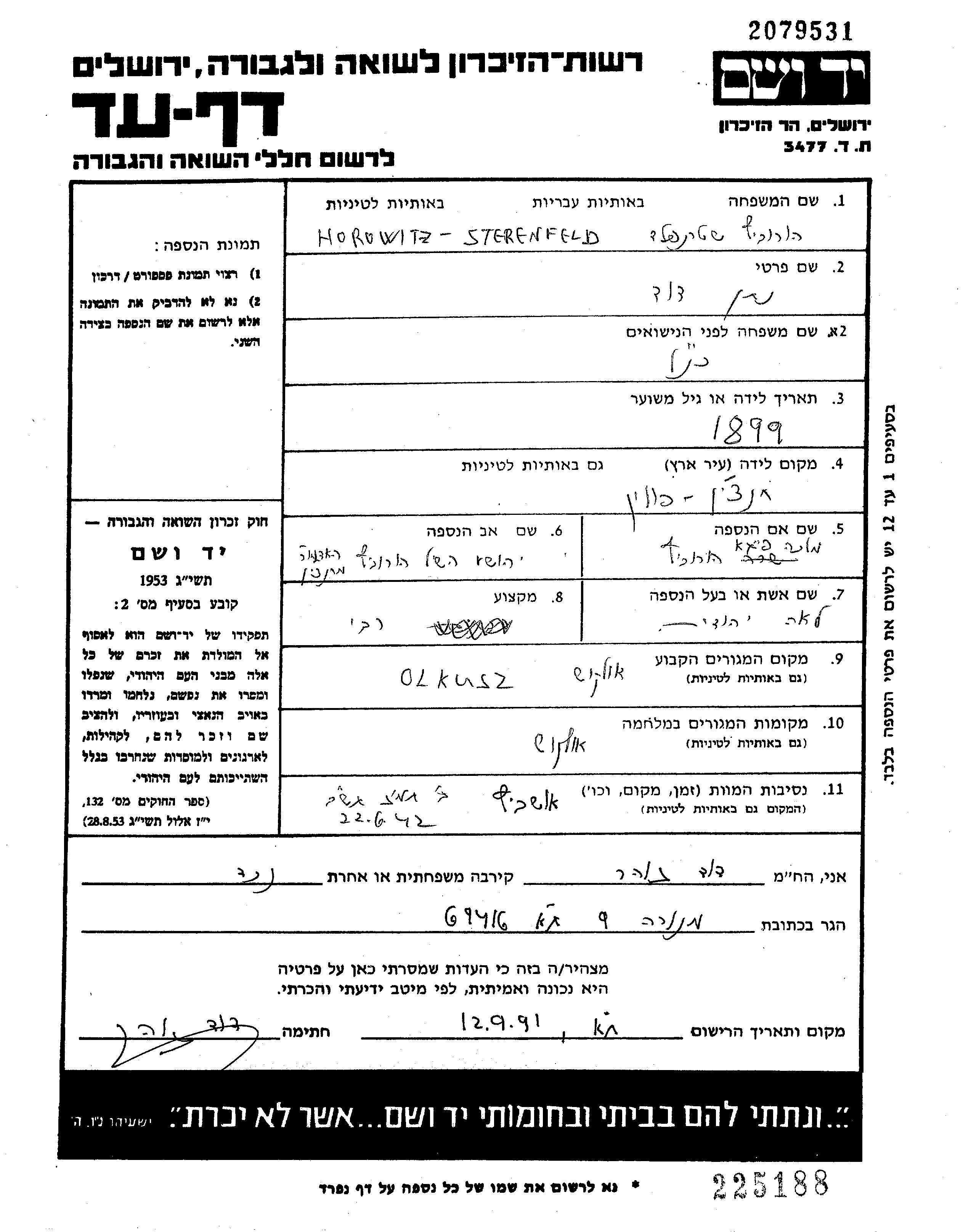 Хоровиц Штеренфельд Натан Давид 1899 Олькуш, Польша Лист свидетельских показаний