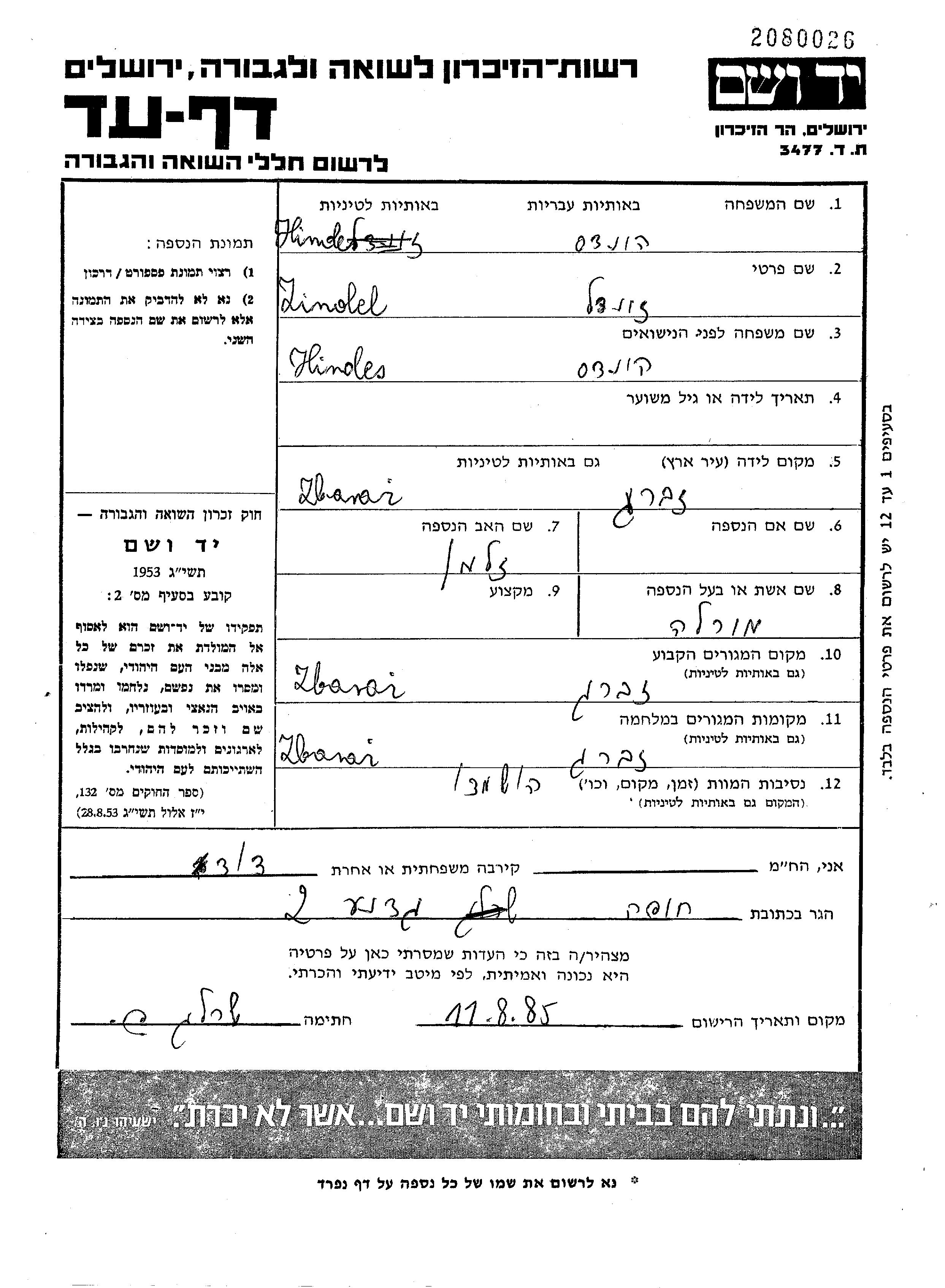 Зиндель Хиндес, место рождения: Збараж, Польша. Отец: Залман. Женат / замужем. Место жительства до войны: Збараж, Польша. Место во время войны: Збараж, Польша.