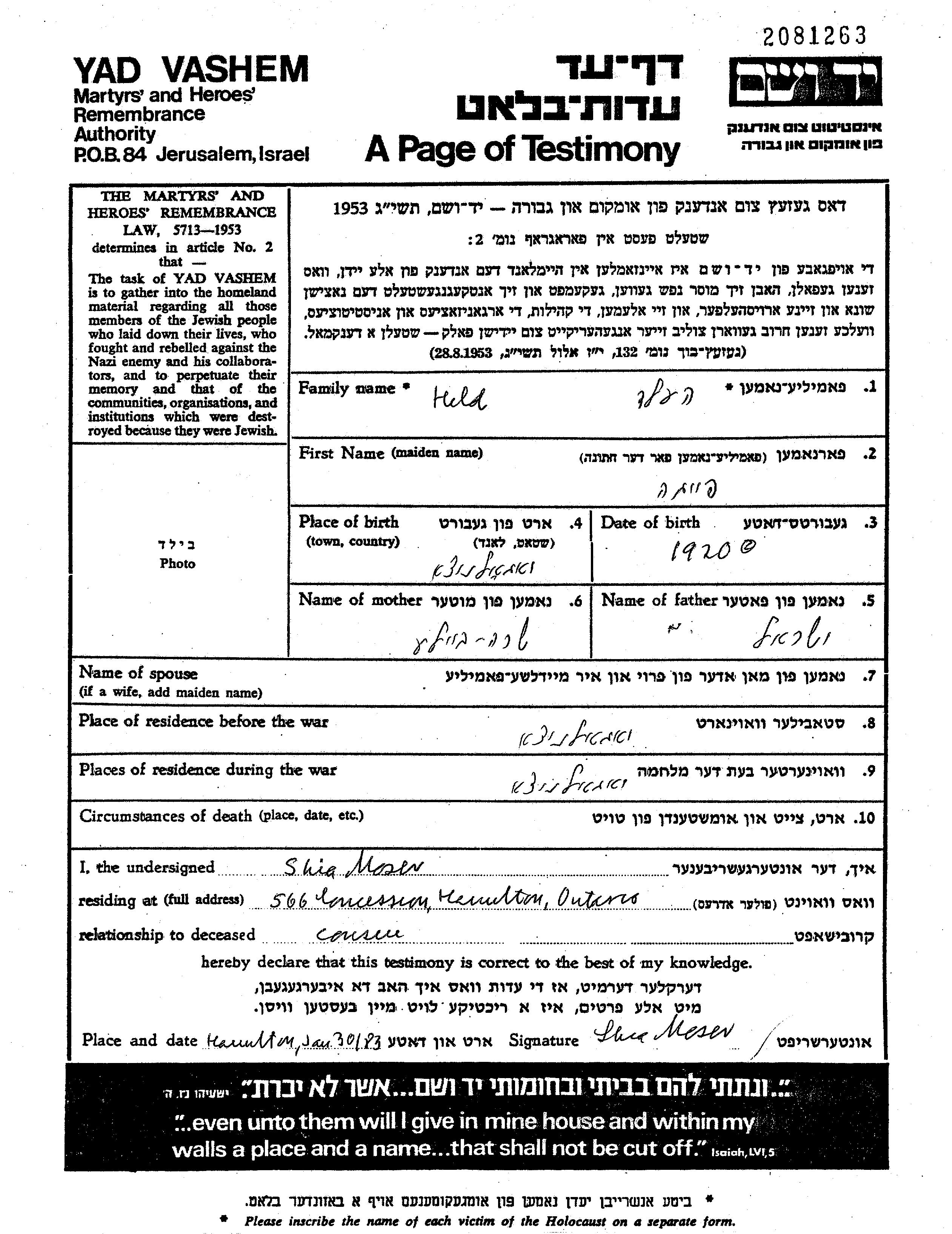 Фейга Хельд, место рождения: Ягельница, Польша. Отец: Исраэль, mать:Бейле Сара, девичья фамилия Мозер. Место жительства до войны: Ягельница, Польша. Место во время войны: Ягельница, Польша.
