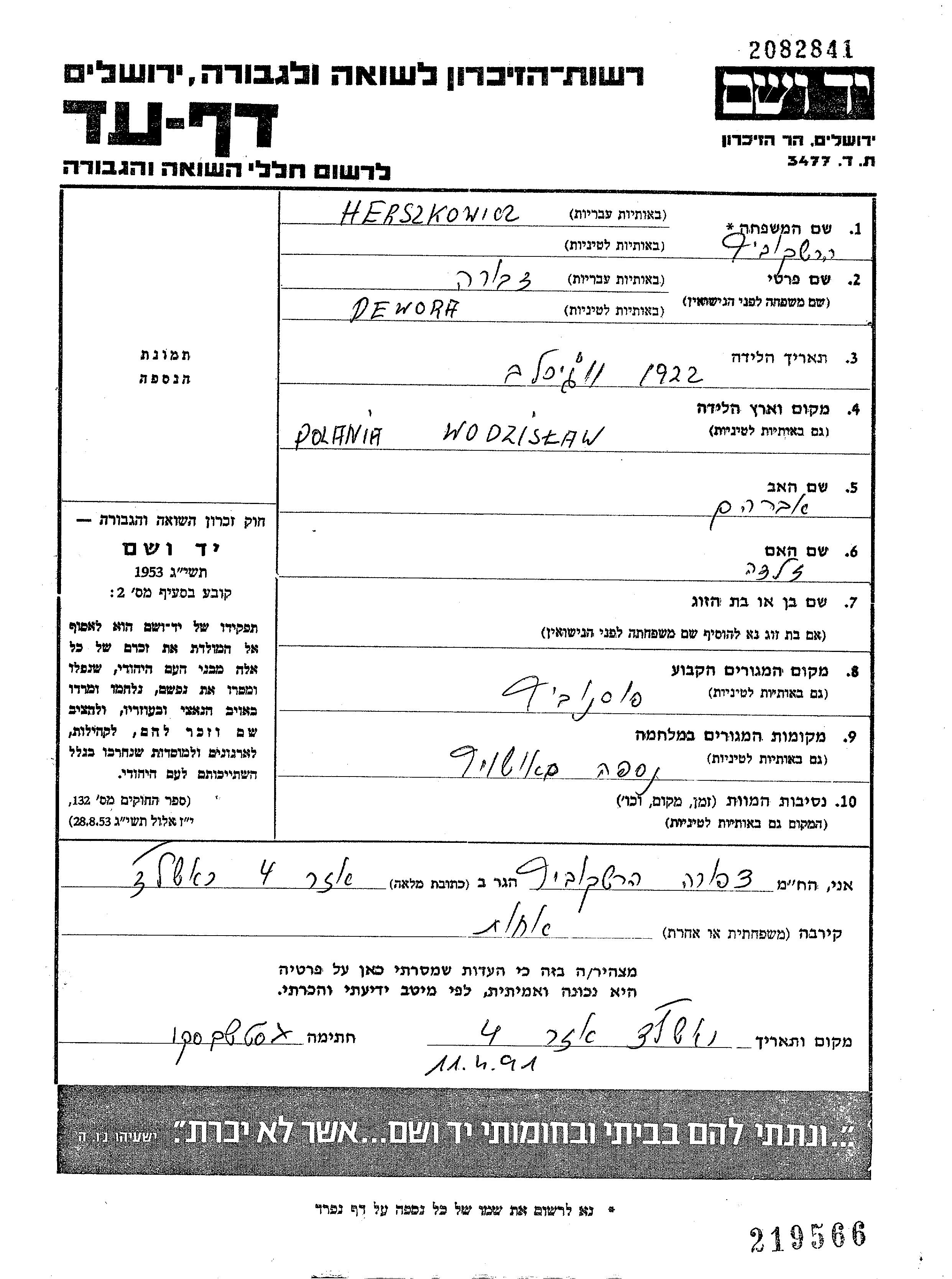 Девора Хершкович, место рождения: Водзислав, Польша. Отец: Авраам, mать:Зельда, девичья фамилия Зеликфельд. Место жительства до войны: Сосновец, Польша.