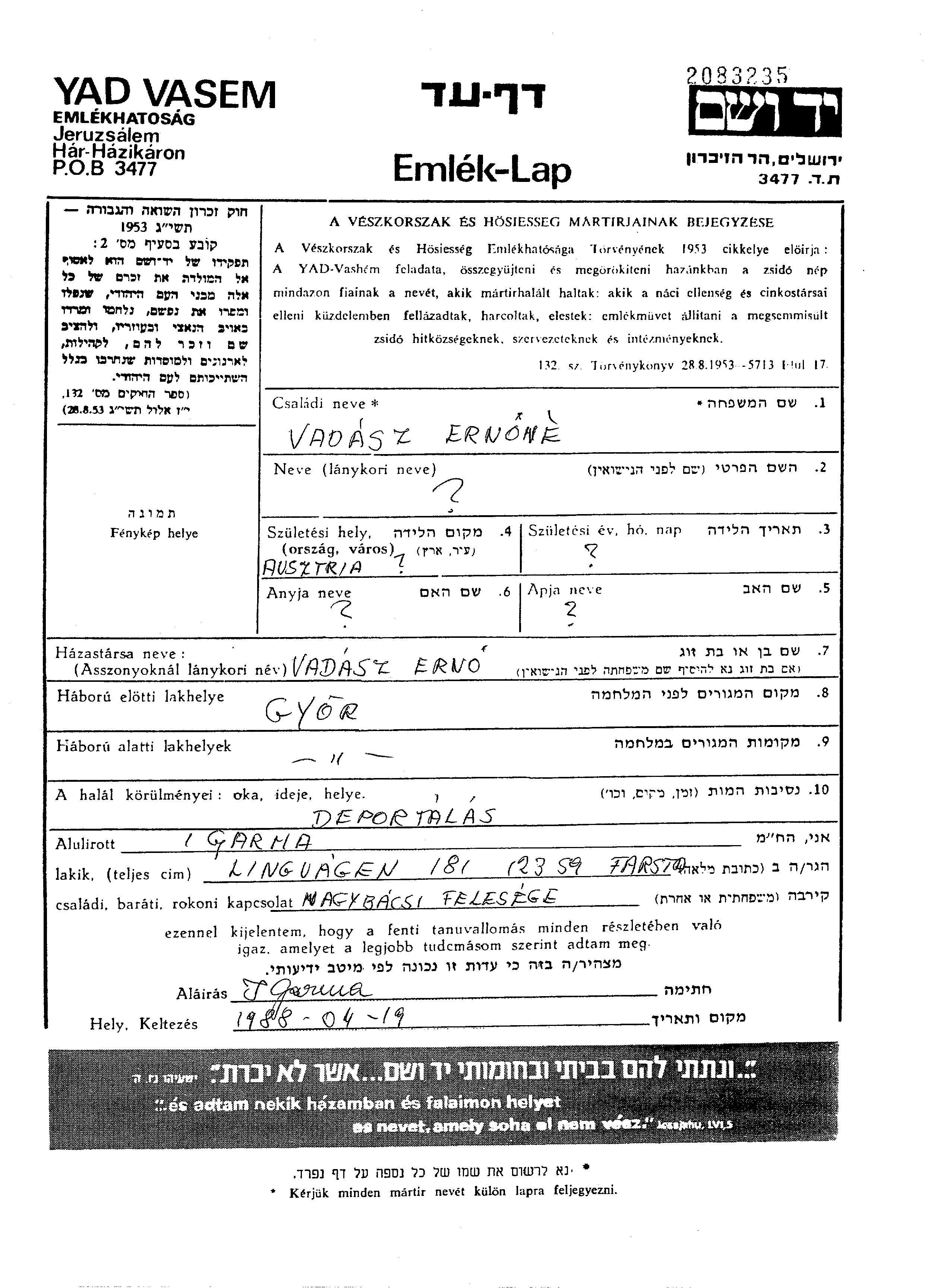 Вадас Имя неизвестно Дьёр, Венгрия Лист свидетельских показаний