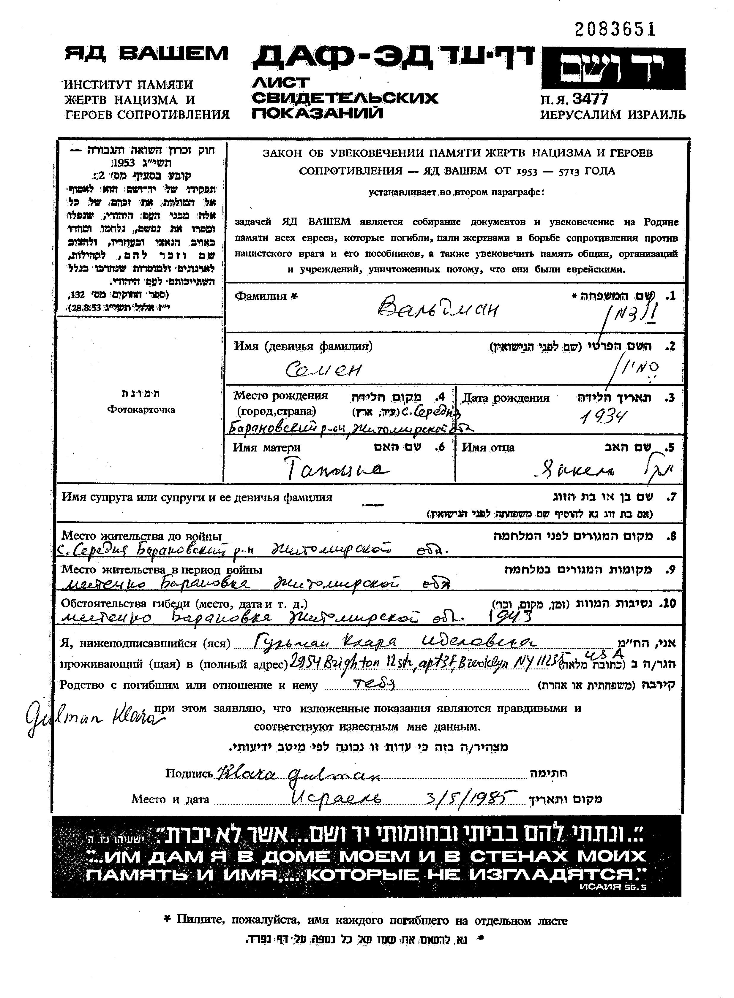 Вальдман Семен Середне, Украина (СССР) Лист свидетельских показаний