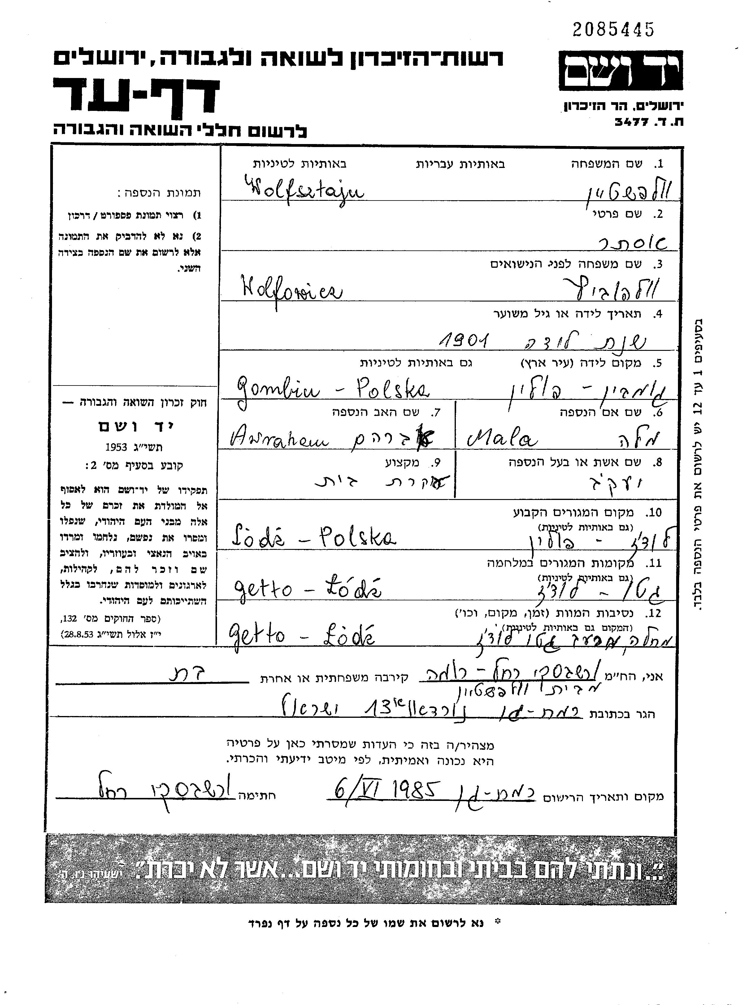 Эстер Вольфштайн, девичья фамилия Вольфович, место рождения: Гомбин, Польша. Отец: Авраам, mать:Мала. Домохозяйка. Женат / замужем. Место жительства до войны: Лодзь, Польша. Место во время войны: Лодзь, Польша.
