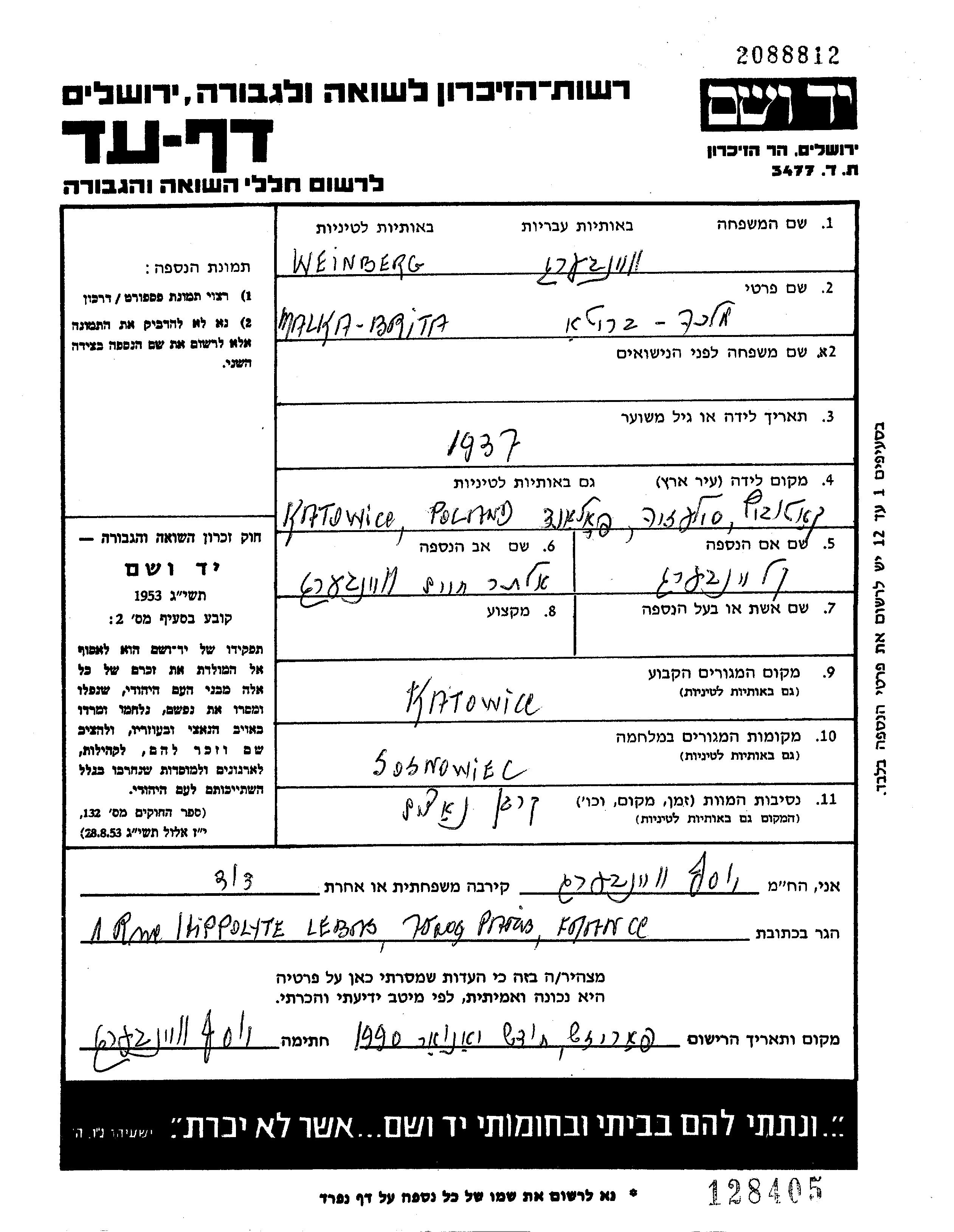 Брита Малка Вайнберг, место рождения: Катовице, Польша. Отец: Алтер Хаим. Ребенок. Место жительства до войны: Катовице, Польша. Место во время войны: Сосновец, Польша.