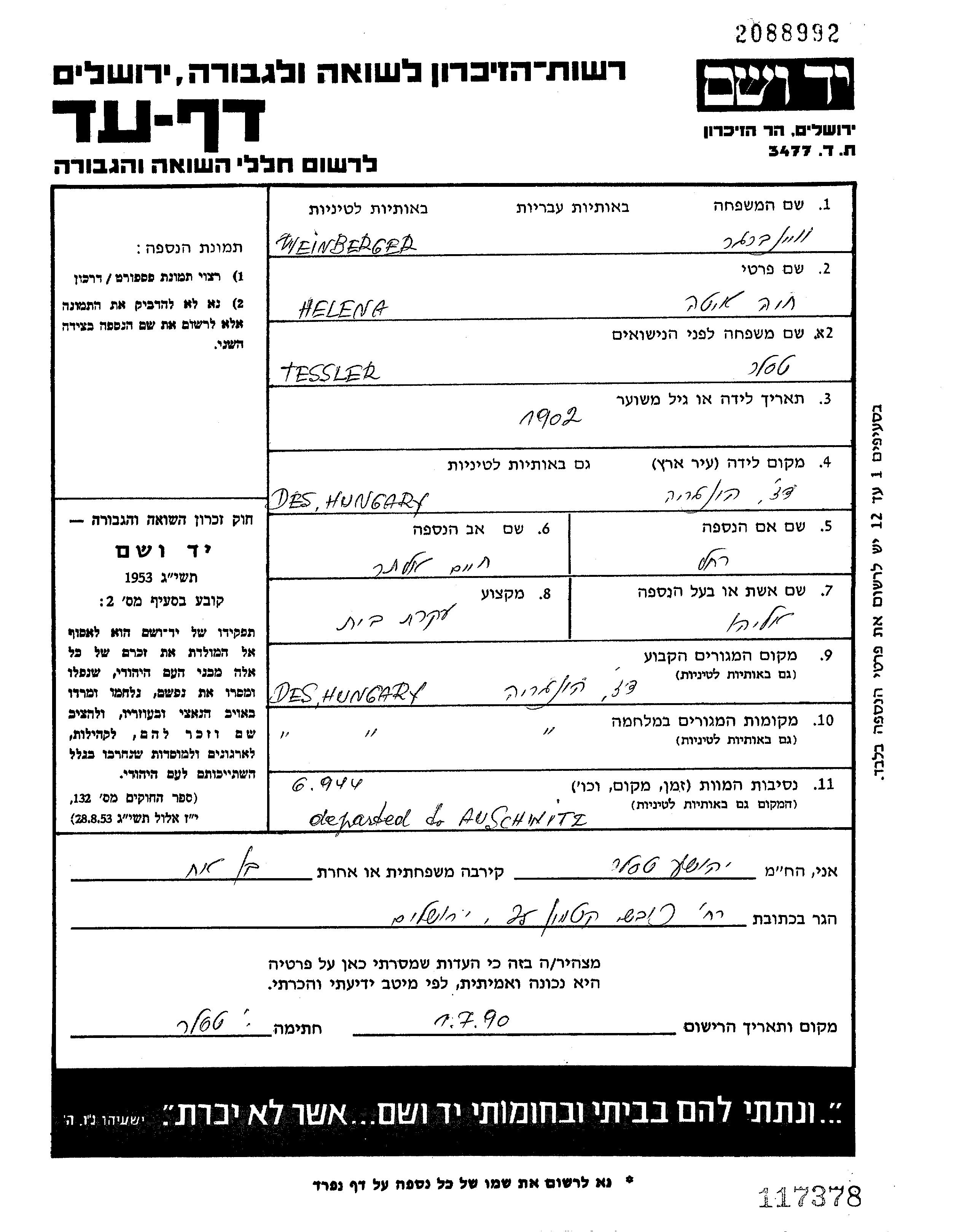 Ита Хая Хелена Вейнбергер, девичья фамилия Тесслер, место рождения: Деж, Румыния. Отец: Хаим Алтер, mать:Рахель. Домохозяйка. Женат / замужем. Место жительства до войны: Деж, Румыния. Место во время войны: Деж, Румыния.