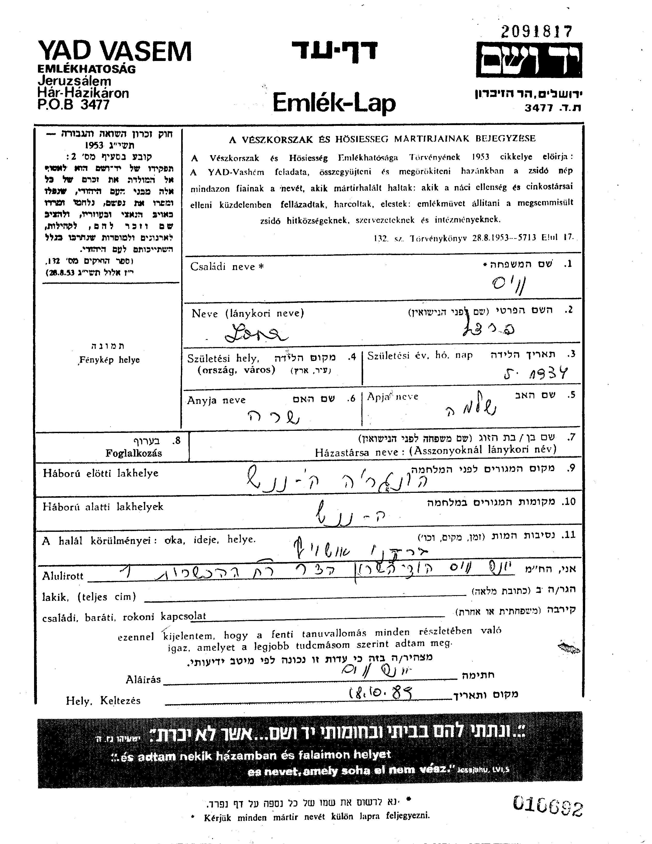 Вейс Фрадл Лора Фрадел 1934 Хайдунанаш, Венгрия Лист свидетельских показаний