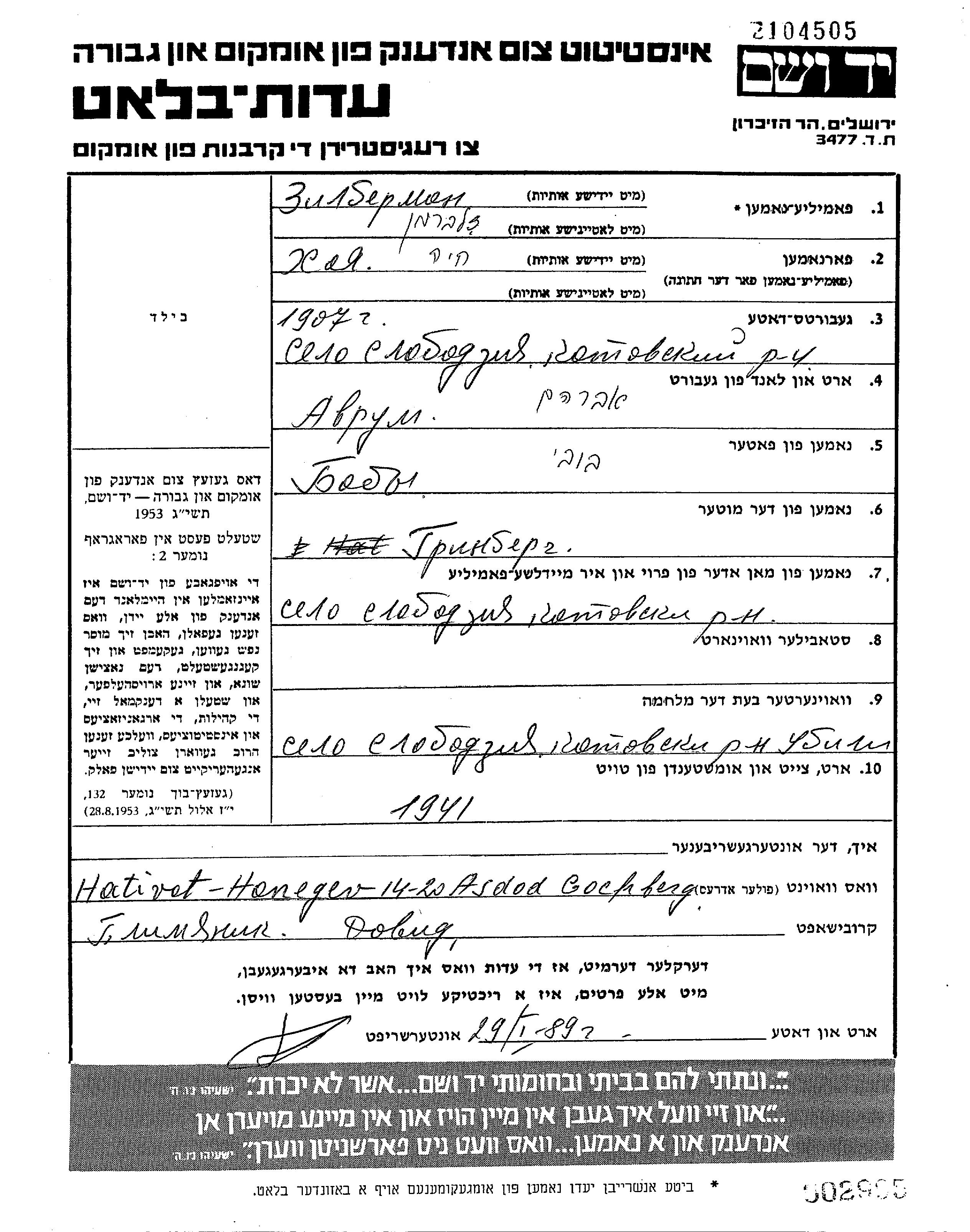 Зильберман Хая 1907 Слободзея, Украина (СССР) Лист свидетельских показаний