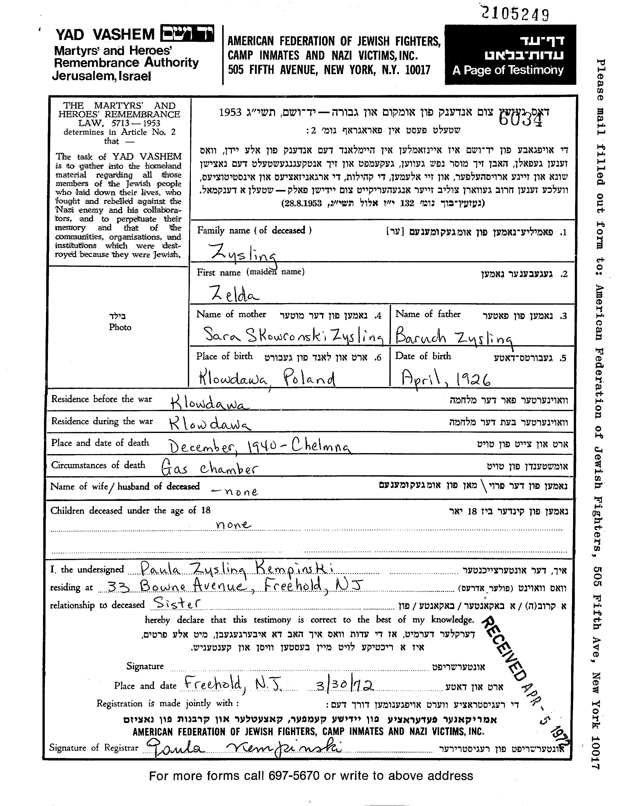 Зислинг Зельда 1926 Клодава, Польша Лист свидетельских показаний