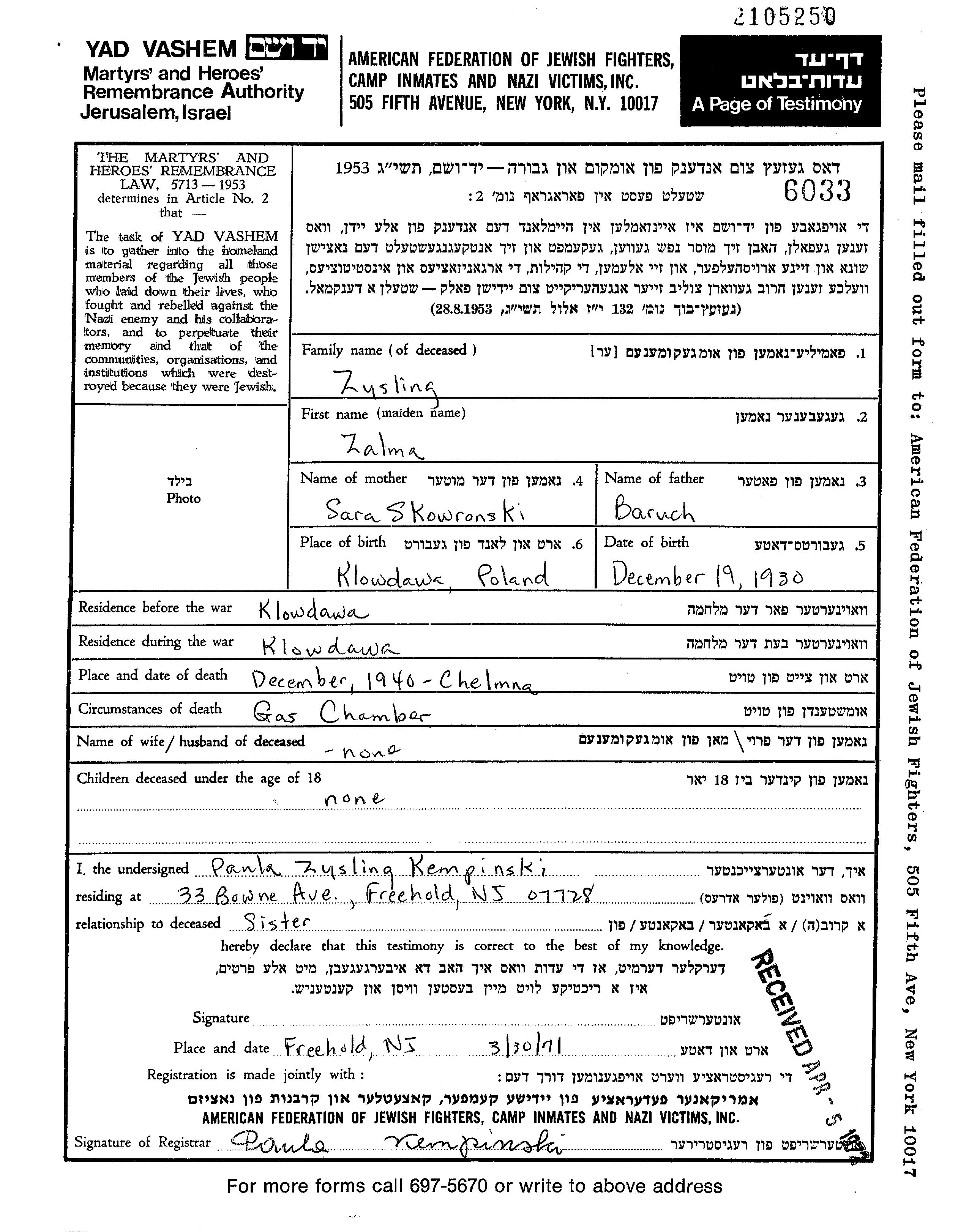 Зислинг Зальма Зельма 1930 Клодава, Польша Лист свидетельских показаний